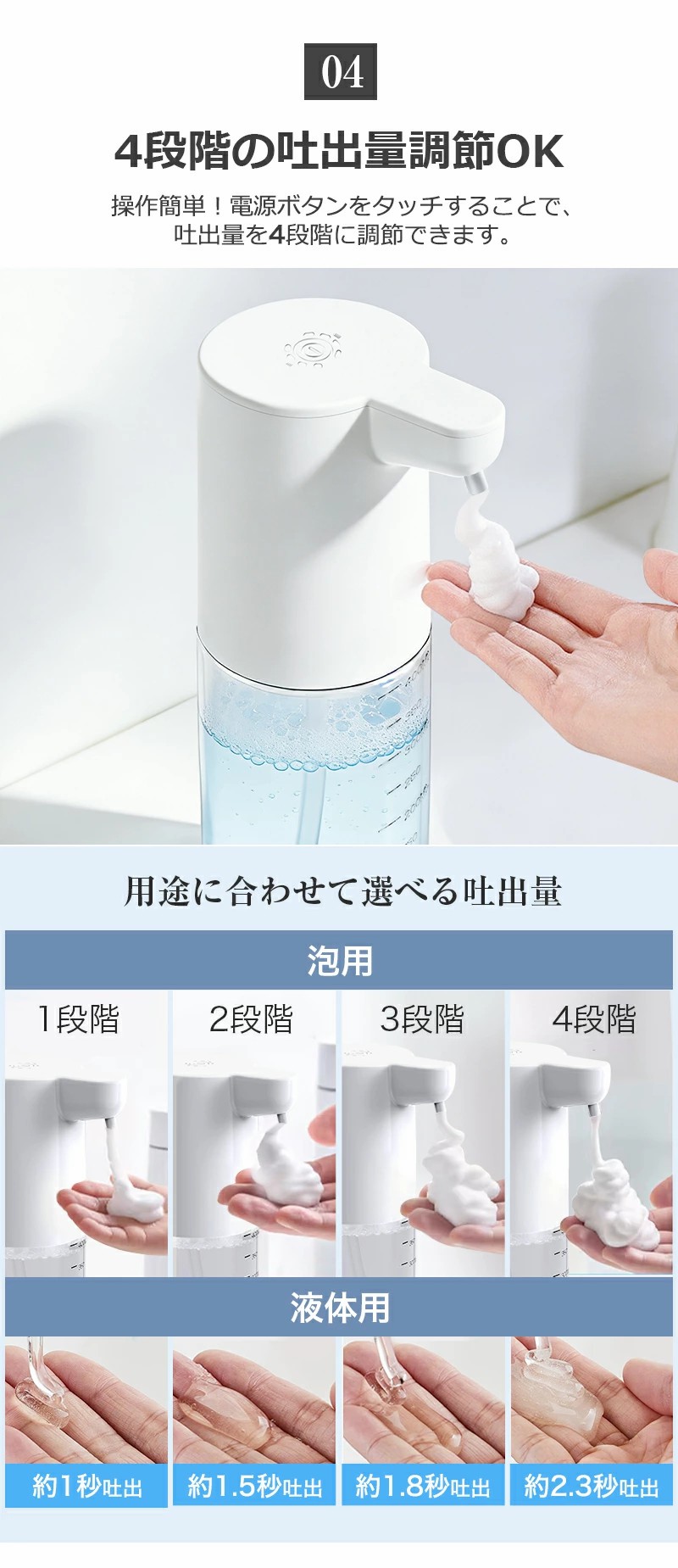 約400mlの大容量タンクを搭載し、頻繁な詰め替えの手間を軽減。4段階の吐出量調整機能により、使用シーンやお好みに応じて最適な量を設定できます。