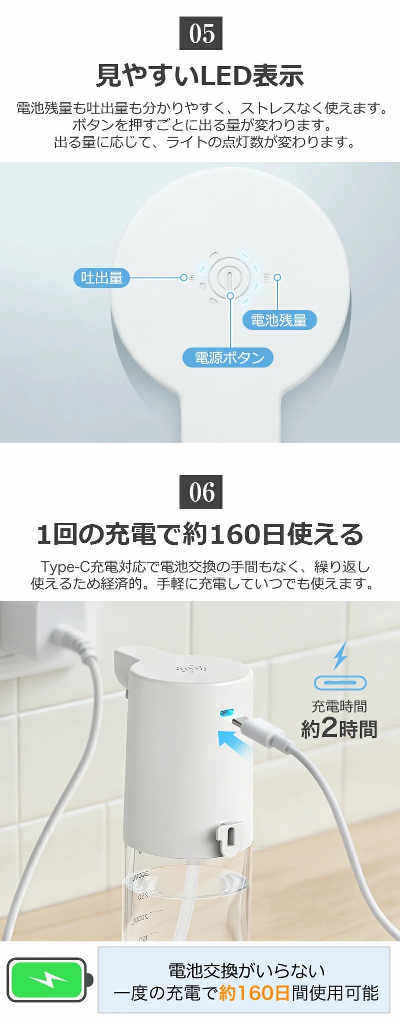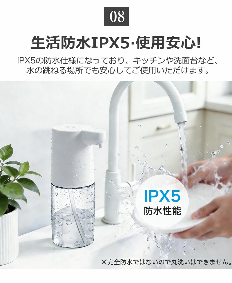 IPX5防水仕様のため、水回りでも安心してご使用いただけます。キッチン、洗面所、トイレなど様々な場所に適用可能。食器用洗剤にも対応しており、日常の手洗いや食器洗いをより便利にサポートします。