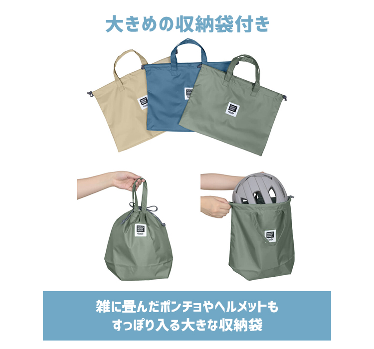 ●雑に畳んだポンチョやヘルメットもすっぽり入る大きな収納袋付き