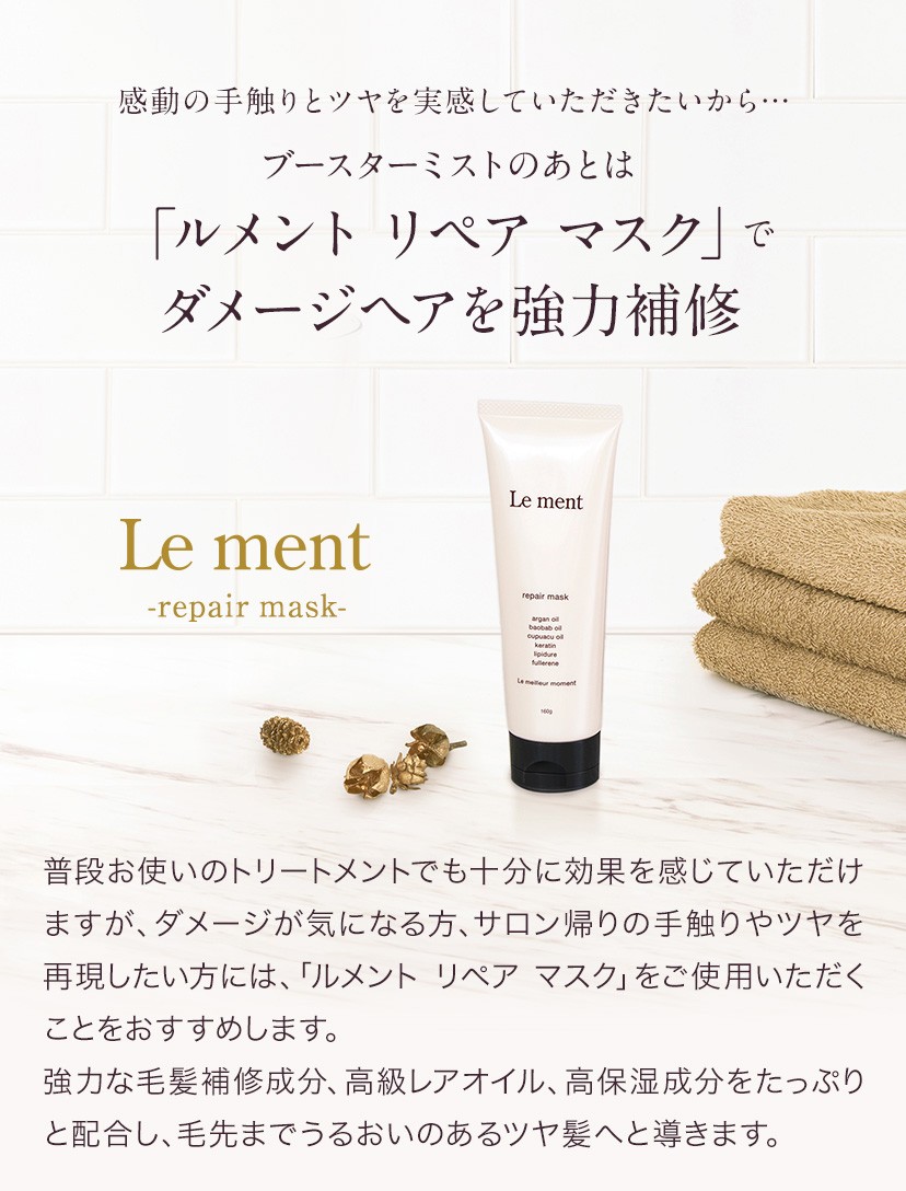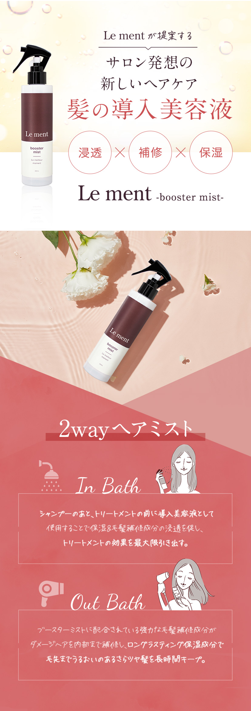 ルメント ブースターミストは、インバス&アウトバスのどちらでも使えるノンシリコン2wayヘアミストです。シャンプーのあと、トリートメントの前に「髪の導入美容液」として使用することで保湿&補修成分の浸透を促し、トリートメントの効果を最大限引き出します。浸透性や吸着性に優れたペリセアが毛髪内部まで補修し、ロングラスティング保湿成分が毛先までうるおいのあるさらツヤ髪をキープします。寝ぐせ直しとして乾いた髪にも使えます。