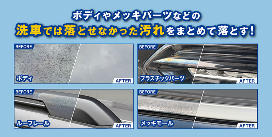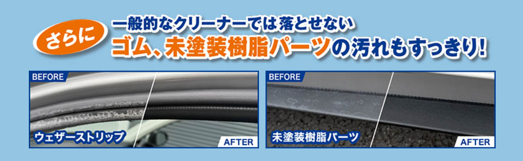 ・高い洗浄力と素材への安全性を両立し、一般的なクリーナーでは落とせないゴム・未塗装樹脂パーツに固着した汚れも素材を傷めたり白残りしたりせずに落とします。