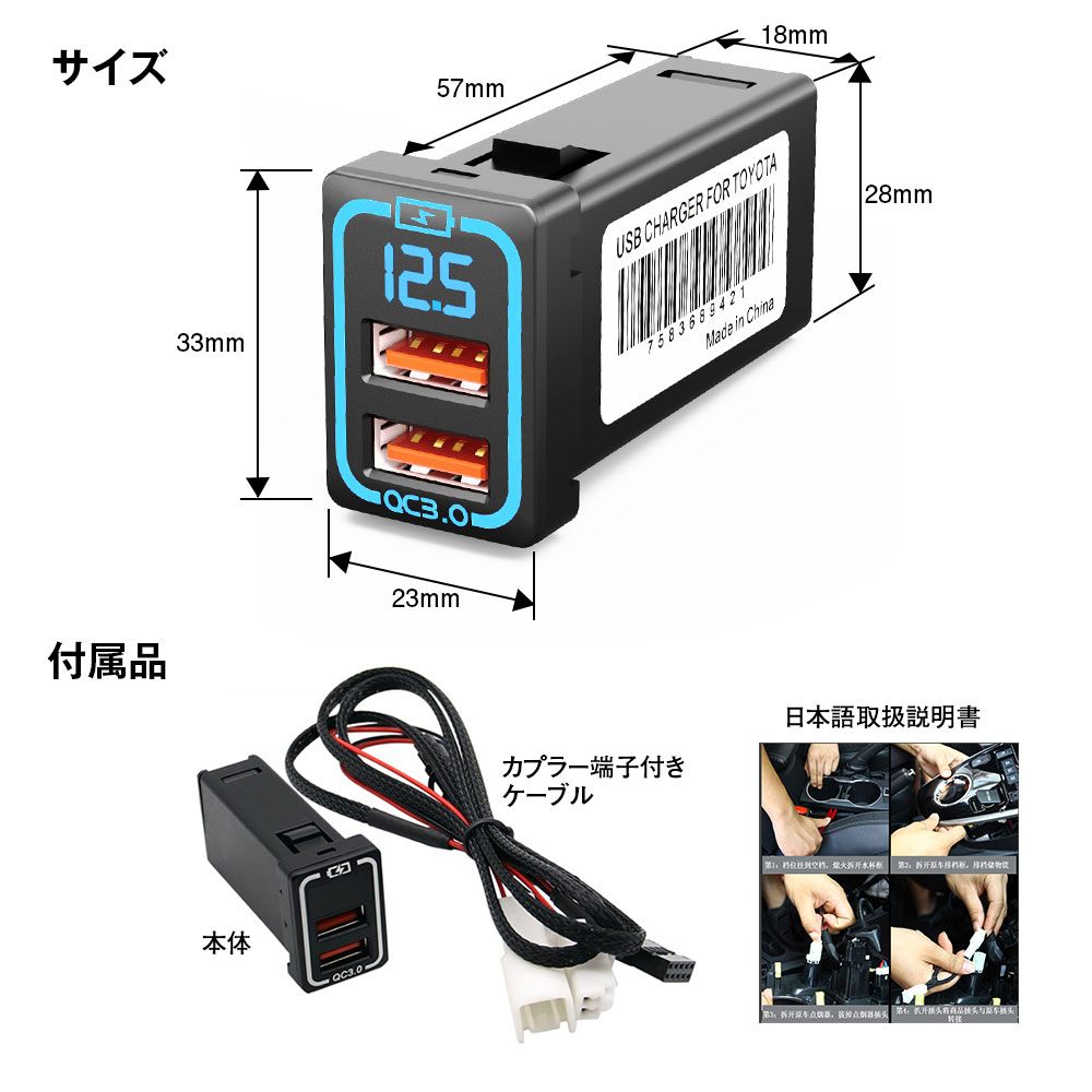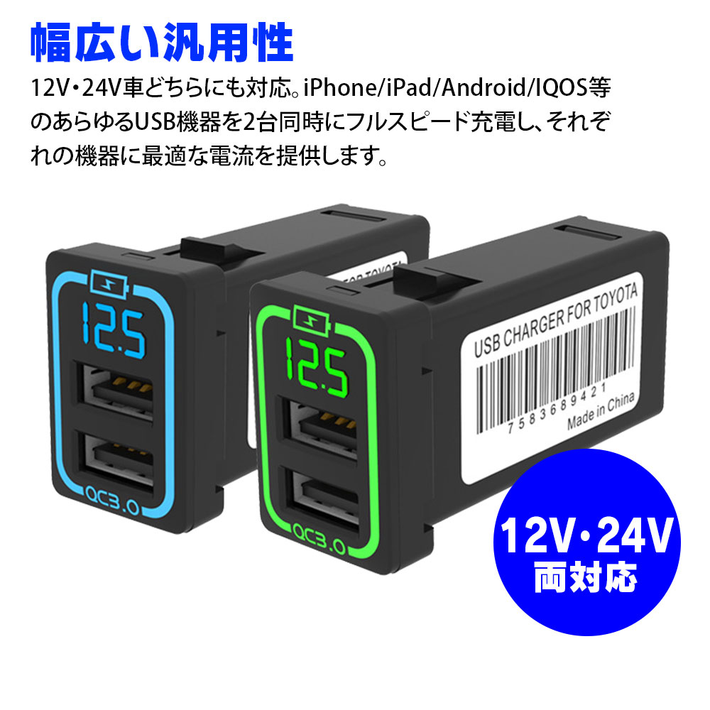 MAXWIN マックスウィン K-USB01-T1B トヨタ車用 USBカーチャージャー ブルー スイッチホールサイズ幅23mmx高さ33mmx奥行き60mmに対応