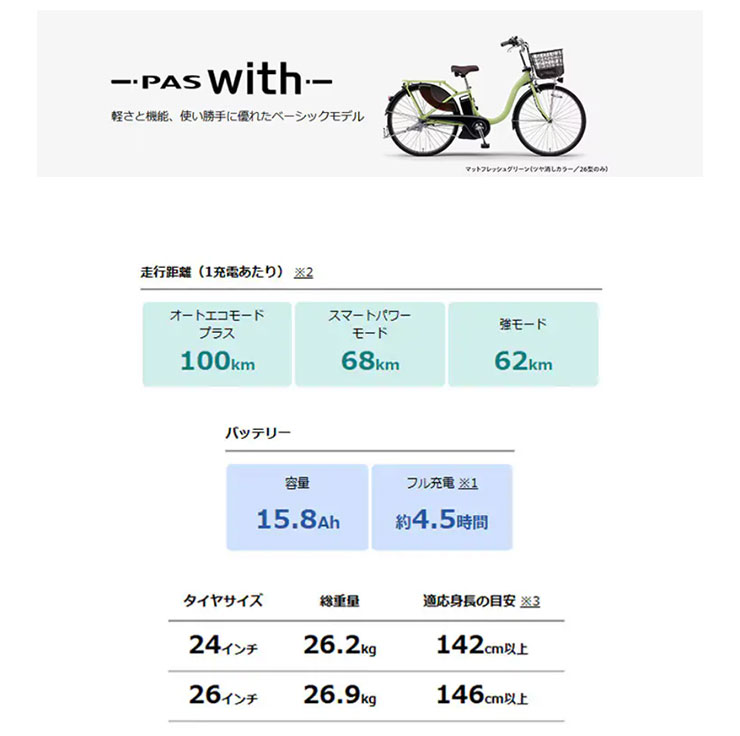 Withシリーズ内最軽量。人気の定番シティサイクル ショッピング、普段使いにおすすめの電動アシスト自転車「パス ウィズ」。