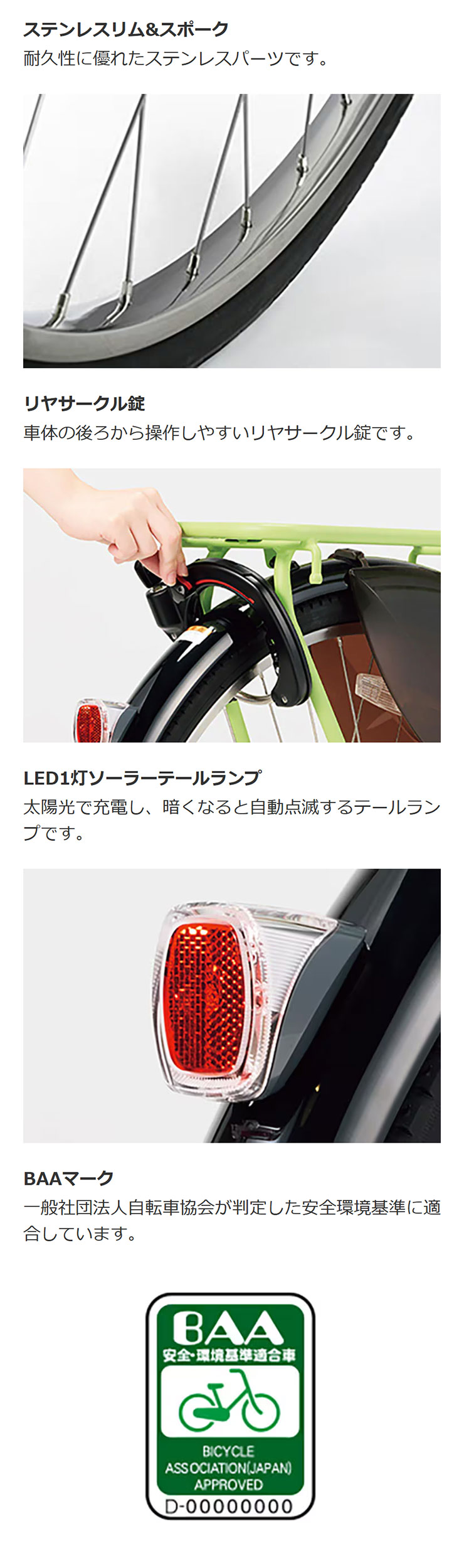 BAAマークが貼付された自転車は、一般社団法人自転車協会が制定した安全・環境基準適合車です。