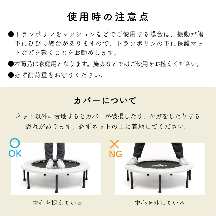 ・トランポリンをマンションなどでご使用になる場合は、振動が階下にひびく場合がございますので、保護マットなどのご使用をお勧め致します。