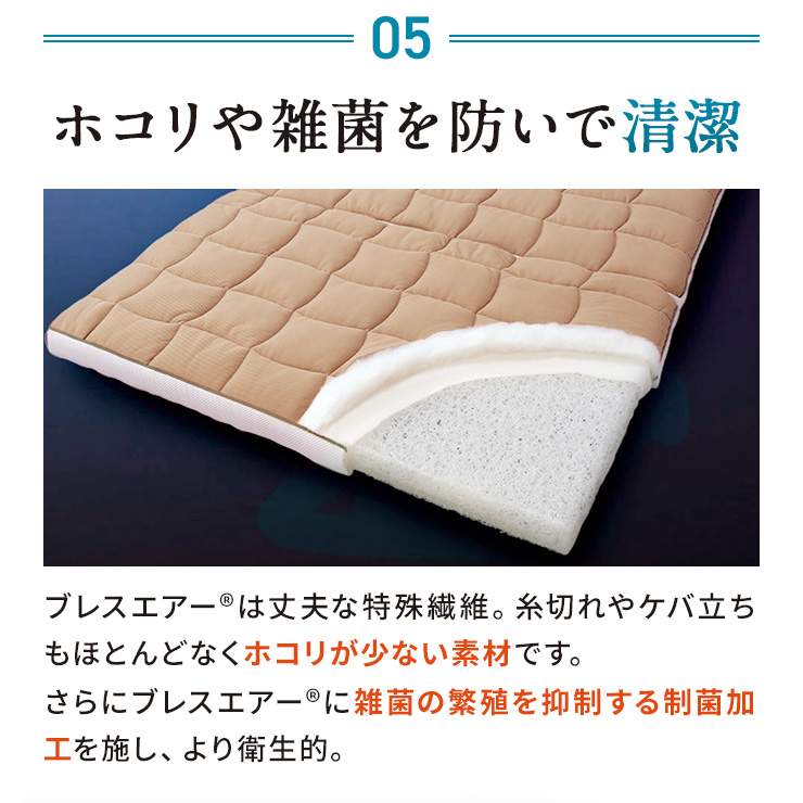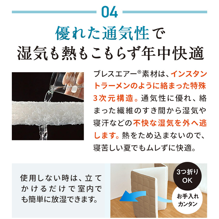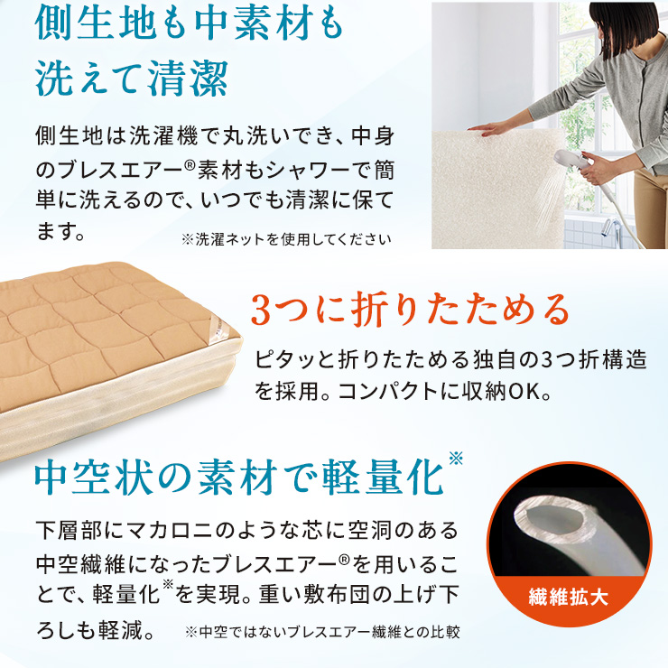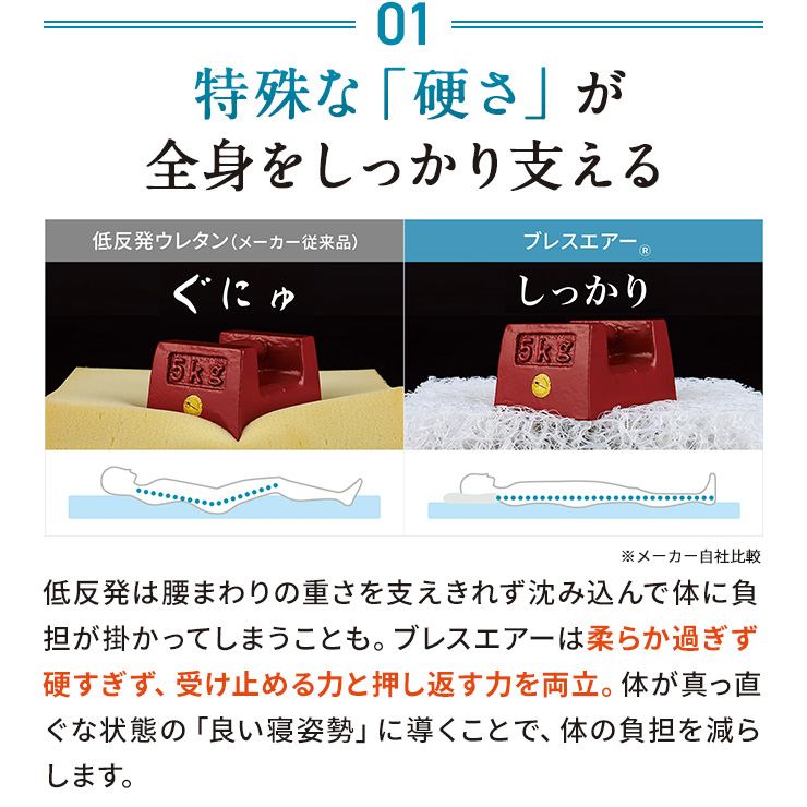 1枚目の画像説明文:肩腰を支えるロングセラー寝具!しっかりタイプのブレスエアー(R)素材を使用し、薄くて軽いのに全身をパワフルに支えます。