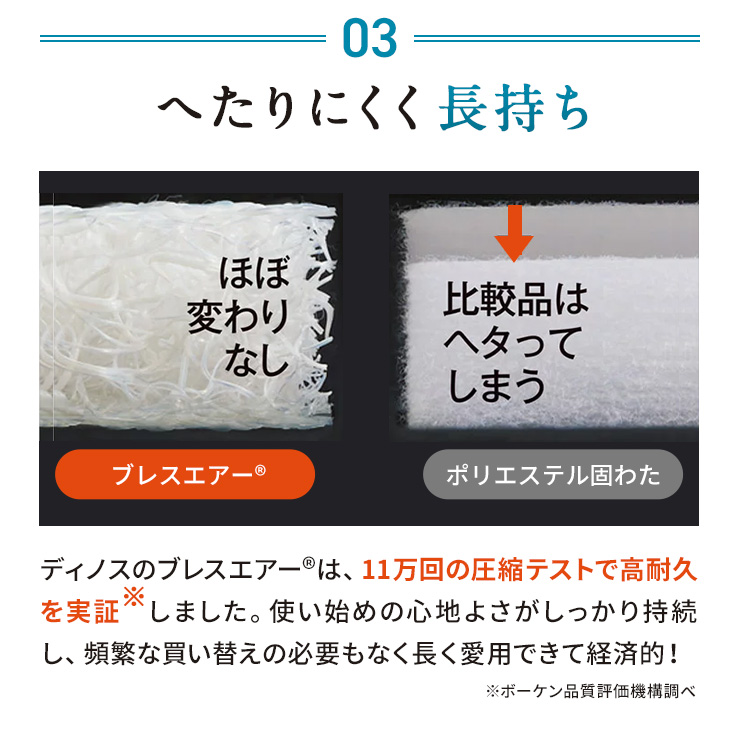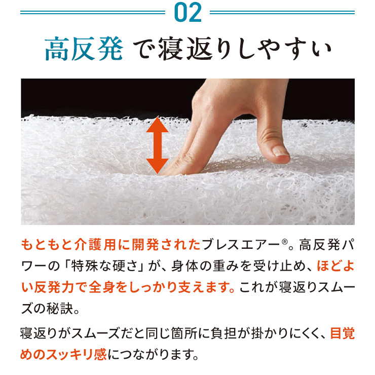 「朝の身体が重い」「すっきり目覚めたい」そんなお悩みに良質な睡眠を目指し、戦略的にアプローチする大人気のブレスエアー(R)シリーズ! 沈み込みやすい腰をしっかり支えて、良い寝姿勢に導くことで、体への負担をとことん軽減!さらに反発力がスゴイので寝返りもサポートしてくれます。