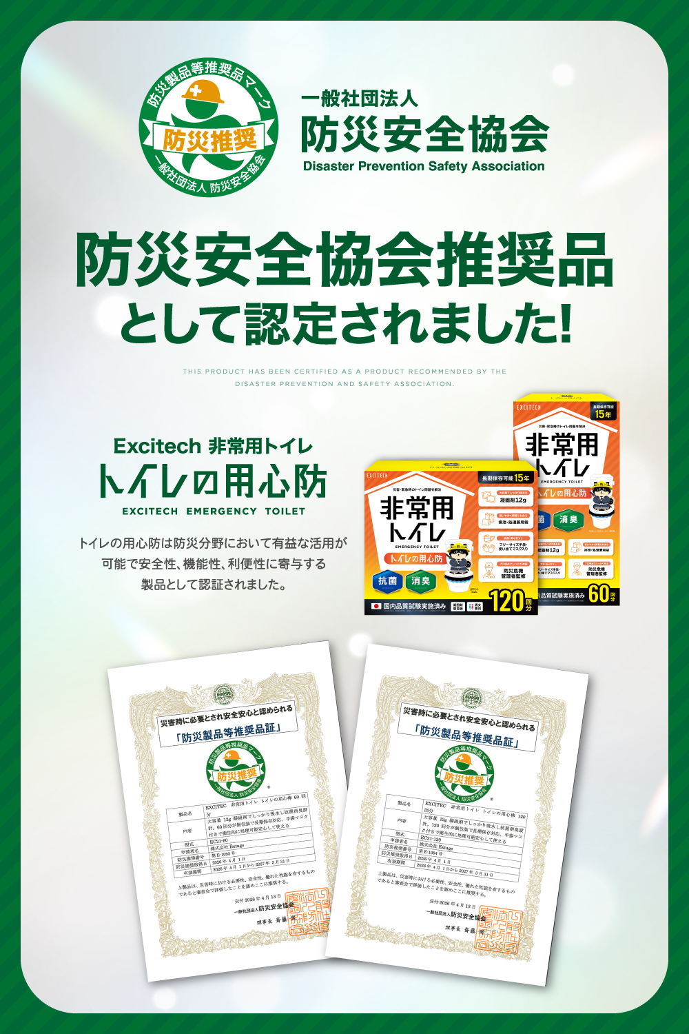 EXCITECH「トイレの用心防」は、災害・停電・断水など水が使えない状況で活躍する非常用トイレです。避難所やアウトドアでも清潔に使用でき、汚物処理も簡単。臭いが漏れにくい設計で衛生面にも配慮し、非常時の不安を軽減します。【日本防災安全協会認証品】として備蓄にも適した安心設計です。