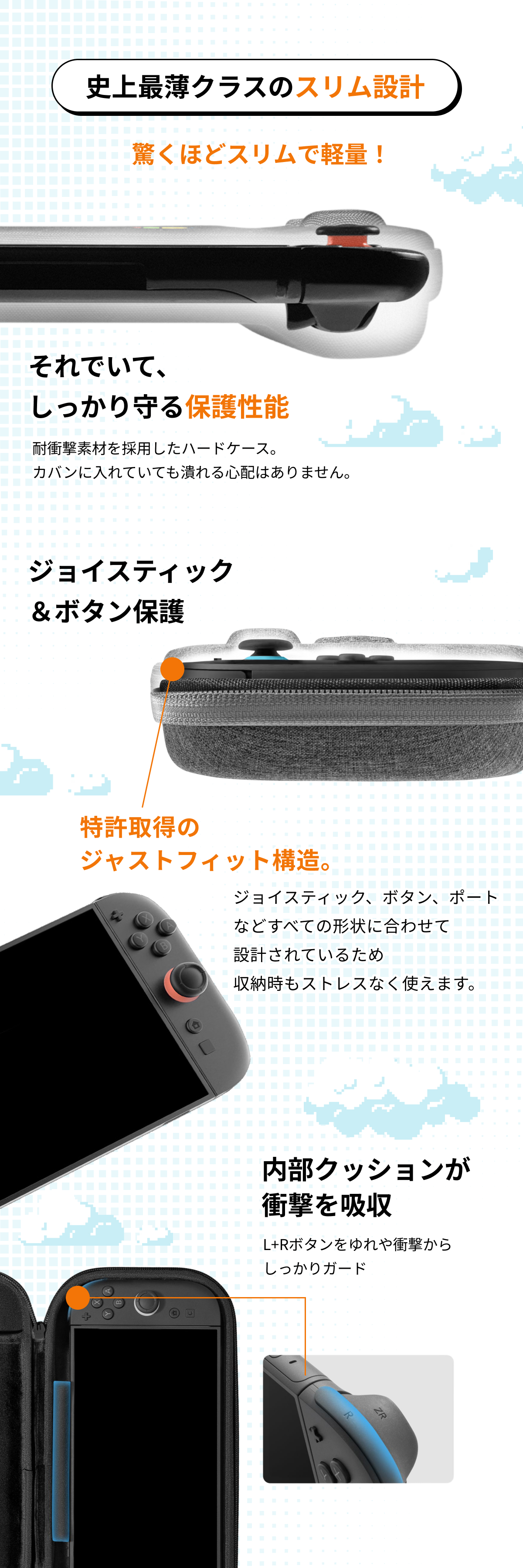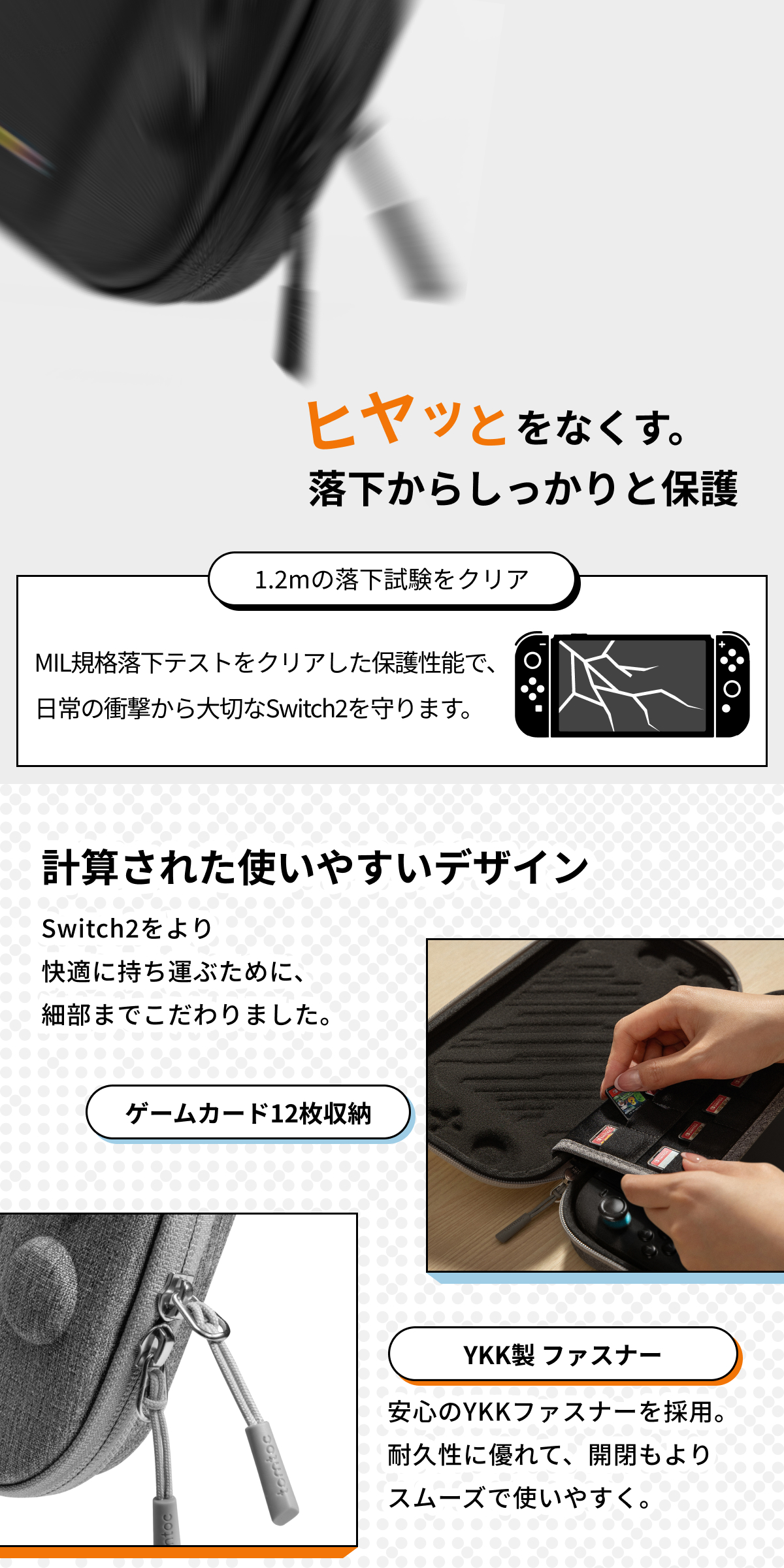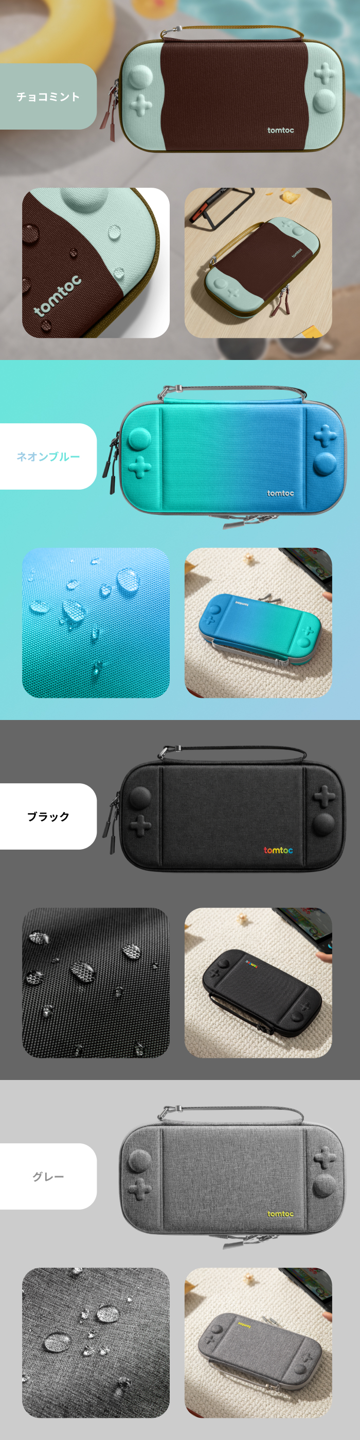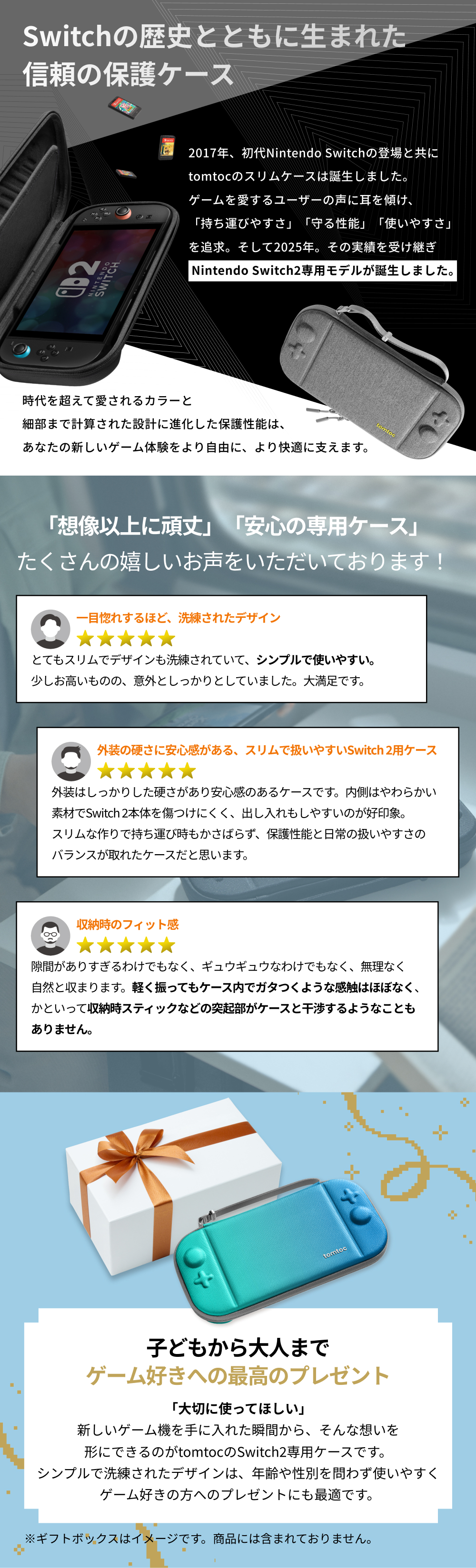 | 商品説明 | Switch 2に不可欠な一品:2025年登場のNintendo Switch 2専用に設計された、ぴったりフィットの保護ケース。すべてのポートやボタンにシームレスに対応。ゲーム体験をより快適に、ストレスフリーにスタートさせよう。 史上最薄・最軽量:ジョイスティックやボタン、ポートすべてにぴったりフィットする、超スリム&軽量設計。持ち運びに最適で、どんなバッグにもスッと収まる。あなたのSwitch 2を、どこへでも手軽に持ち運べる(※Switch 2本体は付属しません。使用例イメージです)。 安心の保護性能:耐衝撃素材を採用し、落下や衝突からSwitch 2をしっかりガード。内側にはふんわりとしたライニングを施し、画面への傷や衝撃も防止。旅行中も通勤中も自宅でも、大切なゲーム機をしっかり守る。 デザインの革新・品質保証:シンプルな美しさを表現。使いやすいバックル、調整可能なリストストラップ&ハンドル、滑らかなYKKジッパー、12枚収納できるゲームカードスロット、こだわり抜いた内装デザインなど、細部にまで品質を追求。 ゲーマーに愛され、メディアも絶賛:前世代のtomtoc Switchケースは、IGN、4Gamer.net、CNET、Wirecutterなど有力メディアから高い評価を獲得。スタイルと保護性能を両立するtomtocは、こだわり派のSwitch 2ユーザーにもぴったり。 |