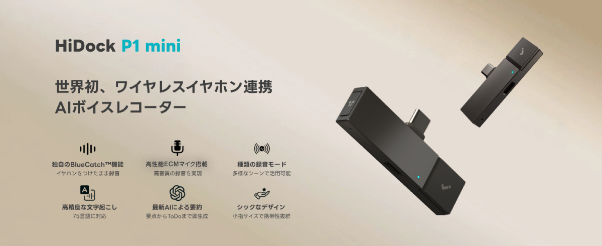 HiDock P1 AI ボイスレコーダー 文字起こし 要約 LLM利用 仕事効率化AIツール ワイヤレスイヤホン ECMマイク ワンタッチ録音 通話/対面 75言語対応 アプリ連動