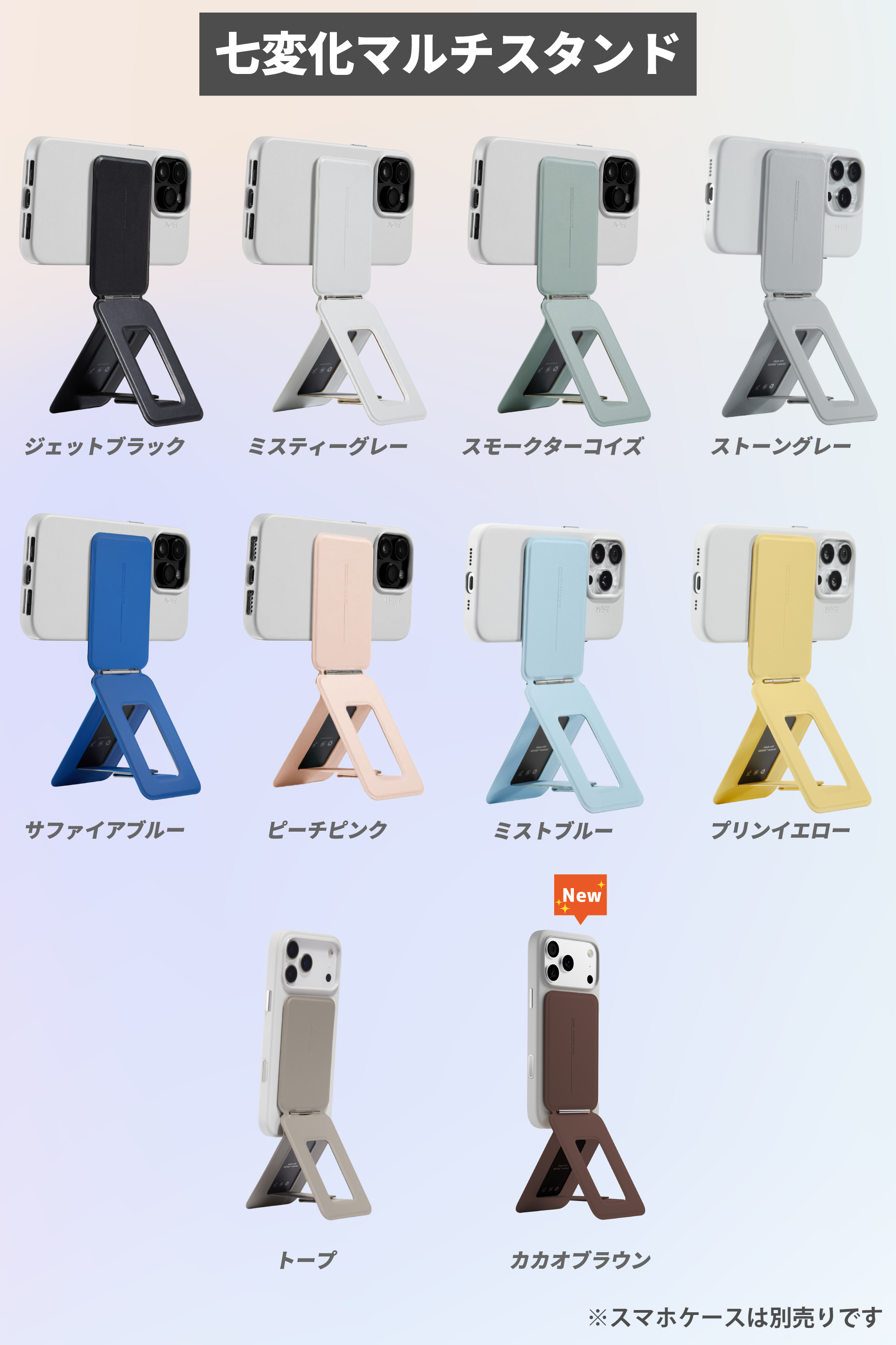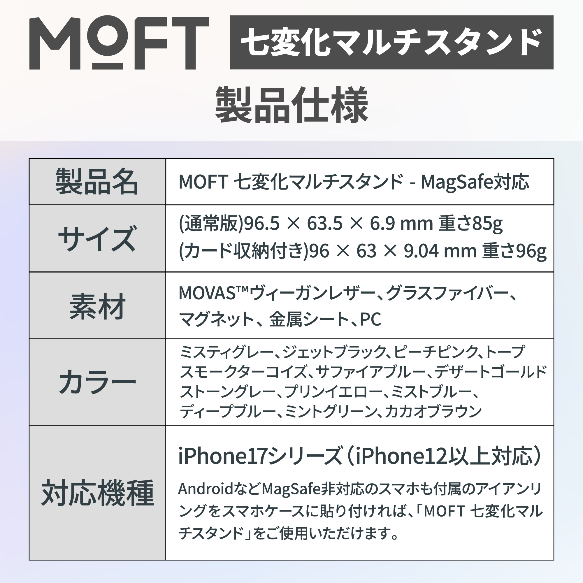 【アイアンリング付き・全機種対応】iPhone 15/14/13/12全シリーズに対応します。また、MagSafe非対応のスマホも付属のアイアンリングをスマホケースに貼り付ければ、「MOFT 七変化マルチスタンド」をご使用いただけます。
