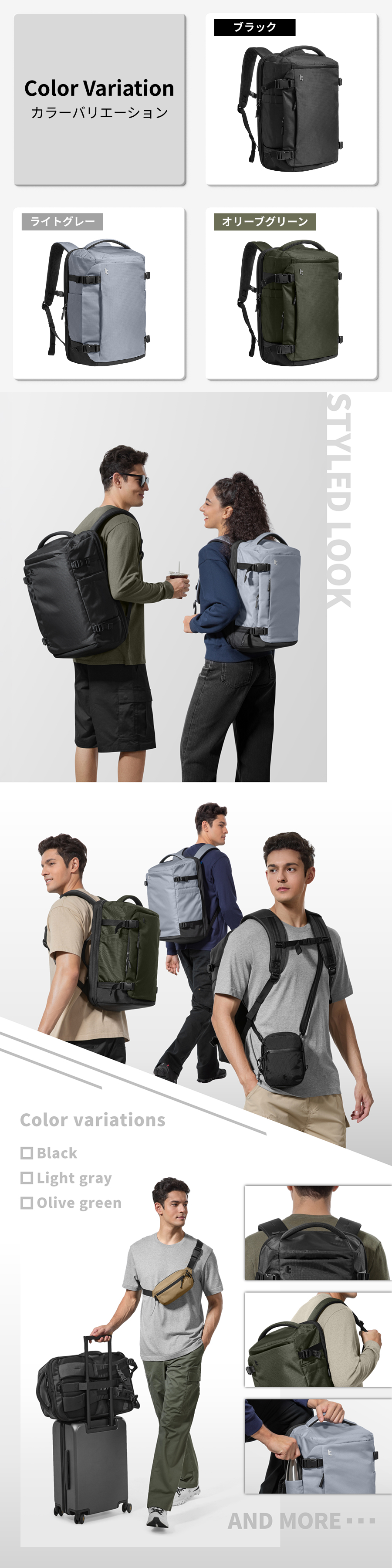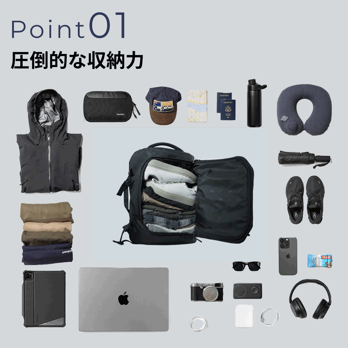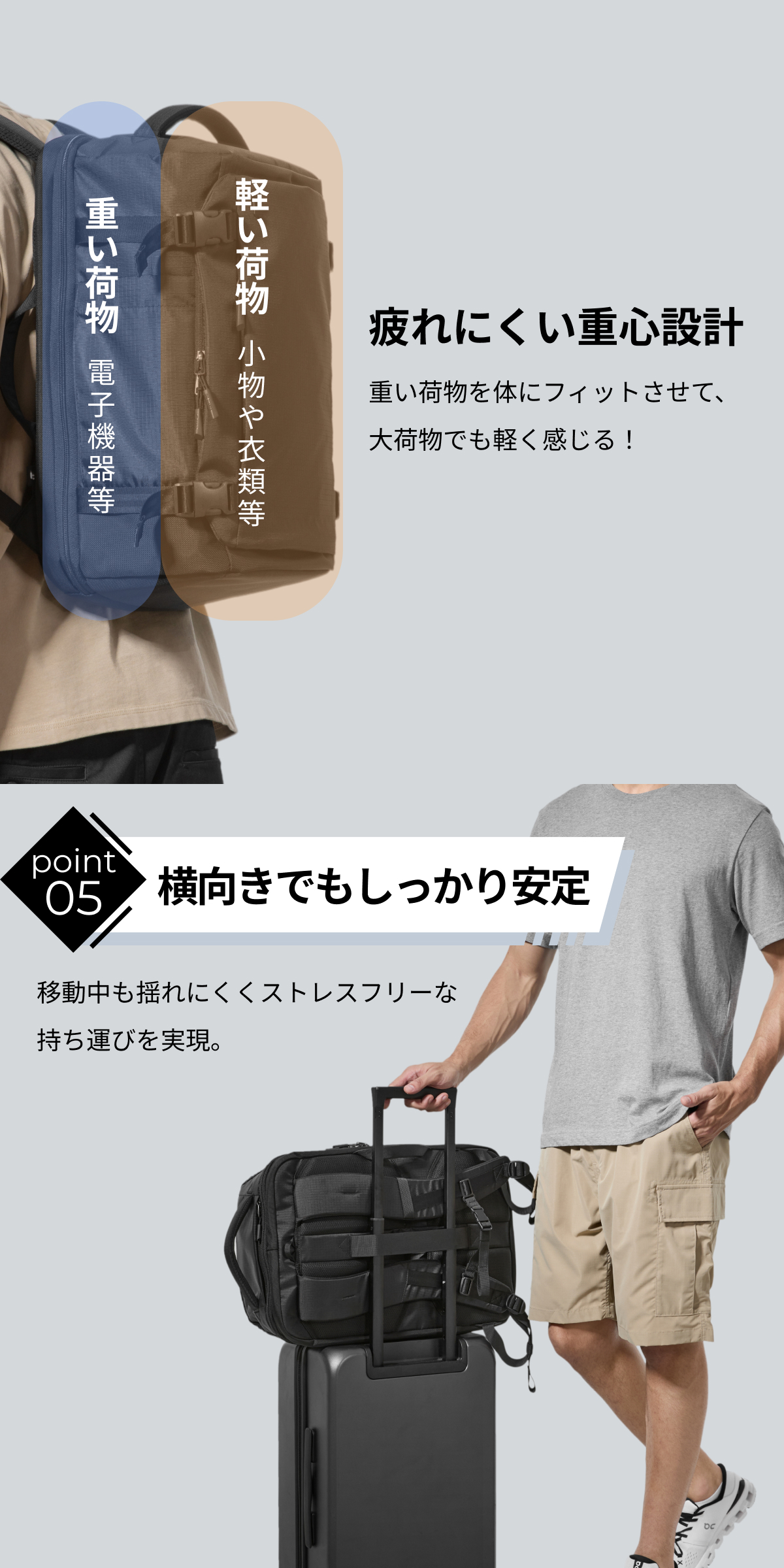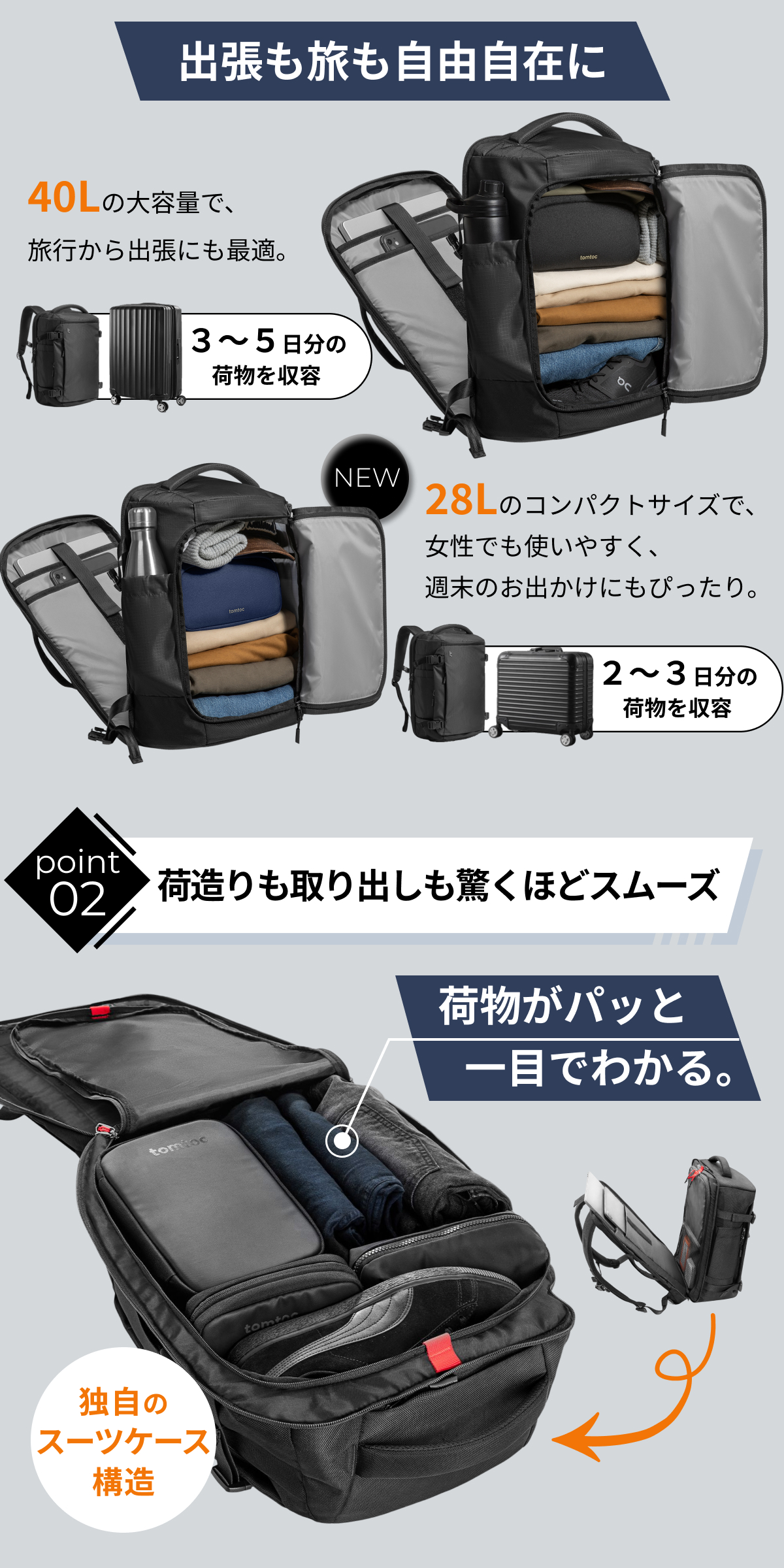 | 商品説明 | 【旅に最適な容量】 1泊2日~2泊3日の必要な荷物だけをスマートに収納する、週末の小旅行や身軽な旅に最適28Lモデルや、長旅に必要なすべてを収め、2泊3日3~4泊5日間の旅行に最適の40Lモデルが展開。サイドにベルトの搭載により中身が少ない時もコンパクトに圧縮され、持ち運びが軽く、機敏な移動を実現します。 【機内持ち込み・保安検査に便利】 PC収納部は180°までフルオープン可能で、主室を開ける必要無しで、保安検査をスムーズに通過できます。大部分航空会社の機内持ち込み手荷物規格に適合*、空の旅に最適。天面&側面ハンドル付きで、満席便の頭上収納棚・飛行機座席・保安検査カゴからでも一瞬でサッと取り出せ、移動中のストレスを最小化します。*航空会社により手荷物規格が異なるので、事前にご利用の航空会社の機内持ち込み手荷物規格をご確認ください。 【スマート収納システム】 仕分け機能にこだわった収納設計!クラムシェルタイプのメイン室はスーツケースのように広く開けて荷物を整理しやすい。専用PC収納ポケットにノートPCやタブレットを分けて収納可能。大きなクイックアクセスフロントポケット、サングラスや小物用のトップポケット、そしてボトルや傘用のサイドポケットなど、旅行・出張を快適にする収納機能が満載し、パスポートやチケット、スマホなどすぐに必要なものがサッと取り出せ、探し物ゼロの快適さが魅力。 【軽量化や高耐久のバランス】 高品質の軽量ポリエステル生地を採用し、軽さと強さを両立。日常の移動や旅行にも耐えるタフな設計です。プレミアムYKKファスナー、堅牢な構造やしっかりとした縫製で、毎日の使用にも長く応え、長持ちや軽やかな持ち運びを実現します。 【快適な背負い心地】 3D構造の背面パネル、厚みのあるフィット感抜群のショルダーパッド、調整可能なチェストストラップにより、人間工学に基づいたサポートを実現し、長時間の移動でも負担を軽減。背面にはスーツケースのハンドルに通せるラゲッジストラップ付きで、移動の多い出張や旅行にも最適です。 |