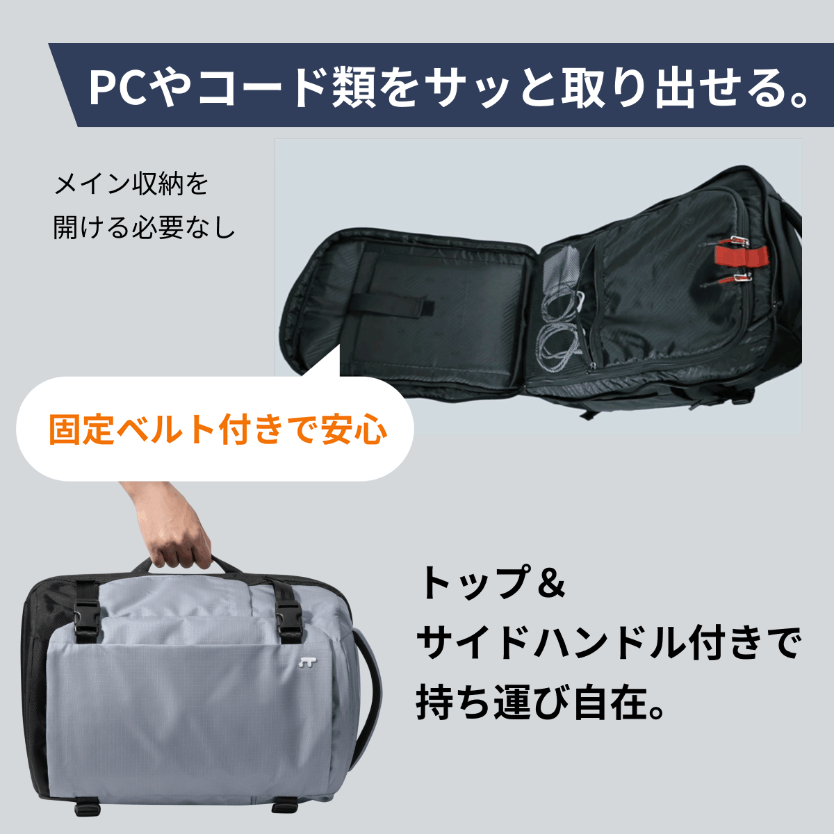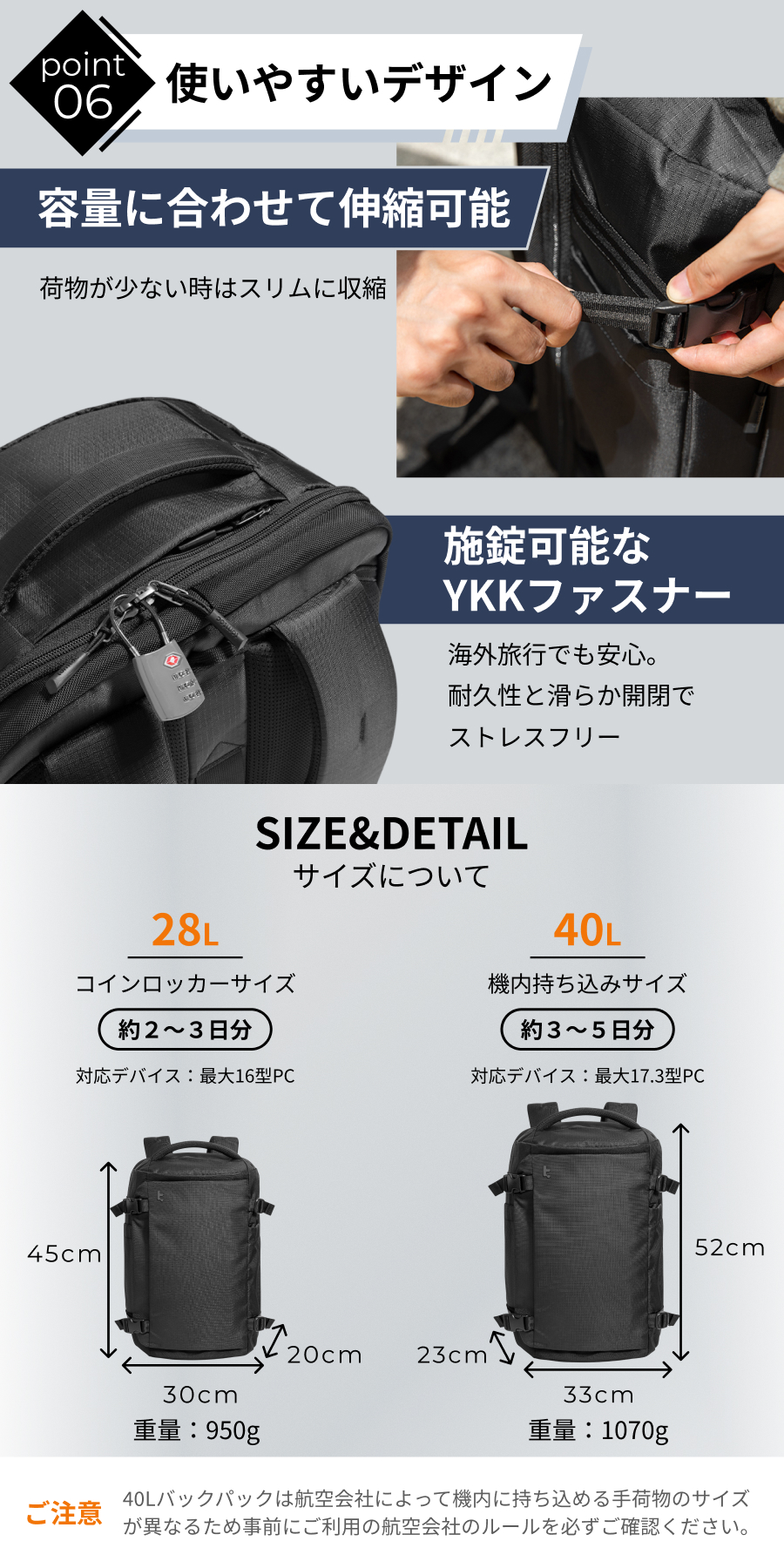 ■28Lの合理化された容量と圧縮可能な構造で、ノートPC・タブレット・旅行必需品を整理収納