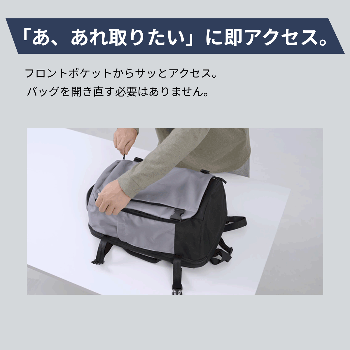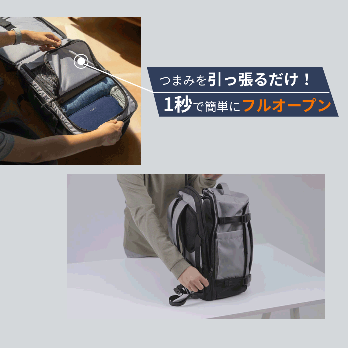 ■クラムシェル方式のメインコンパートメントはスーツケースのような収納性を実現。前面・上部クイックアクセスポケット、側面のドリンクホルダー付き
