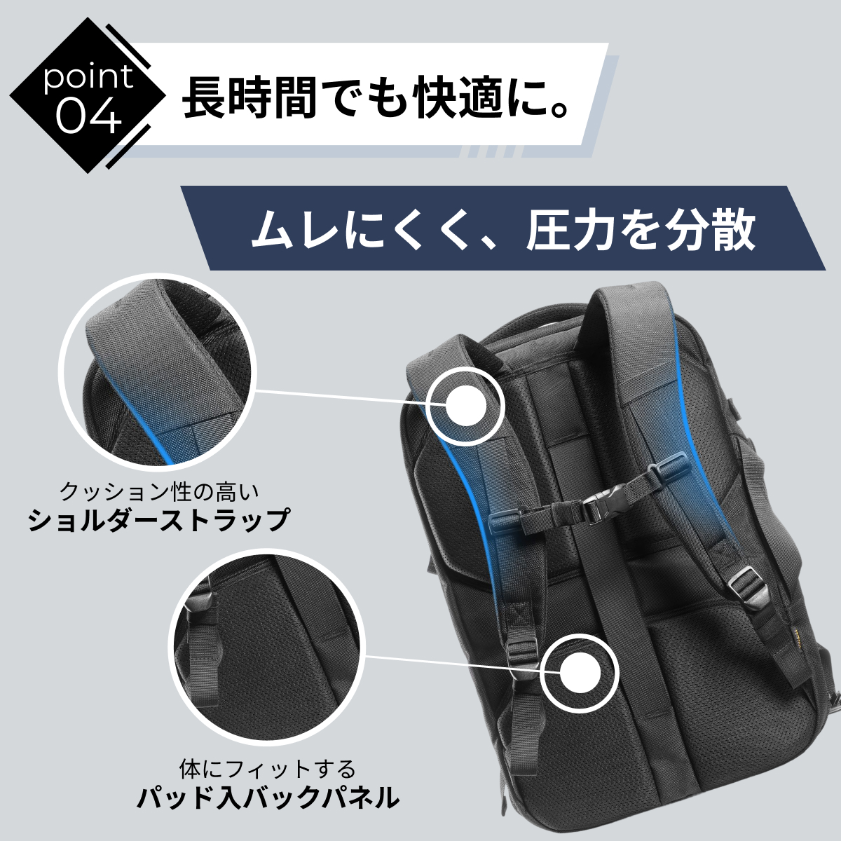 ■3Dパッド入りバックパネル、人体工学に基づいたショルダーストラップ、荷物ストラップ通しで長時間の背?いも快適