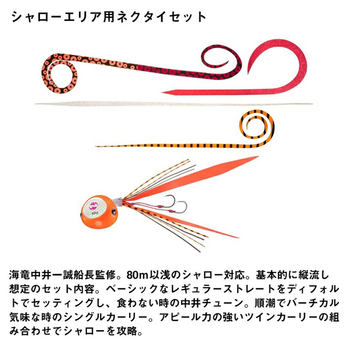 シャロー用は海竜・中井一誠船長監修。80m以浅の縦流し想定で、定番ストレートに加え食い渋り対応の中井チューン、順潮時のシングルカーリー、強アピールのツインカーリーをセット。