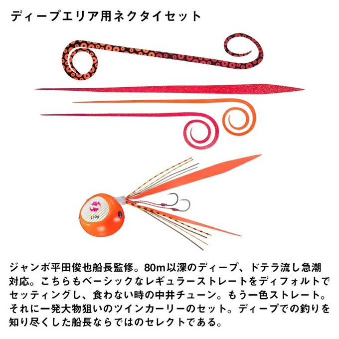 ディープ用はジャンボ平田俊也船長監修。80m以深のドテラ流しや急潮に対応し、ストレート2色+大物狙いツインカーリーを組み合わせた実戦仕様です。