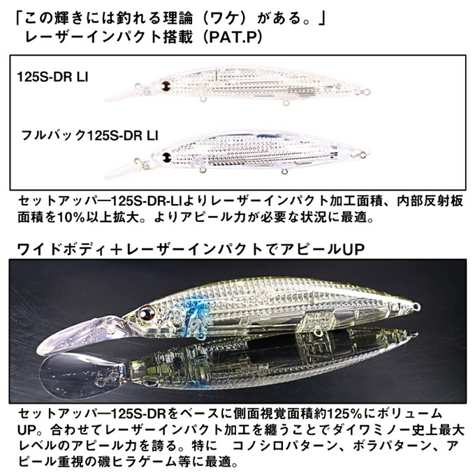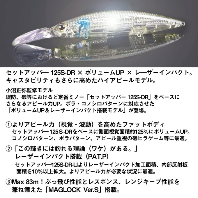 堤防、磯等におけるど定番ミノー「セットアッパー125SDR」をベースにさらなるアピール力UP、ボラ・コノシロパターンに対応させた「ボリュームUP&レーザーインパクト搭載モデル」が登場!