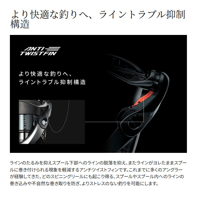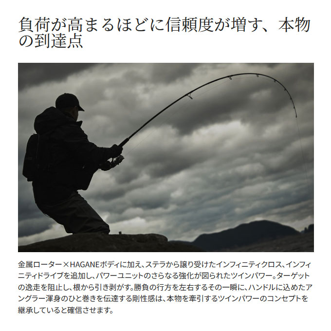 スピニングリールの可能性を広げ続け、盤石の進化を遂げたツインパワー。初代モデルから現モデルまで一貫して過飾をせず、実釣における耐久性、機能的であることを追い求めてきました。この不変のコンセプトがフィールドに足しげく通うコアなアングラーに安心感を与えてくれるとともに、ツインパワーはアングラーと強固に繋がり、その一部となって体験を心に刻んでゆきます。ツインパワーは、ステラに搭載されている最先端の技術、インフィニティクロス、インフィニティドライブ、インフィニティループ、デュラクロス、アンチツイストフィンを搭載。細部に至るまで機能性を追求し、実直なまでにアングラーへ寄り添う存在になります。