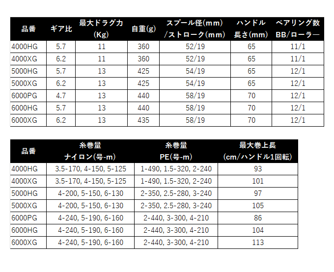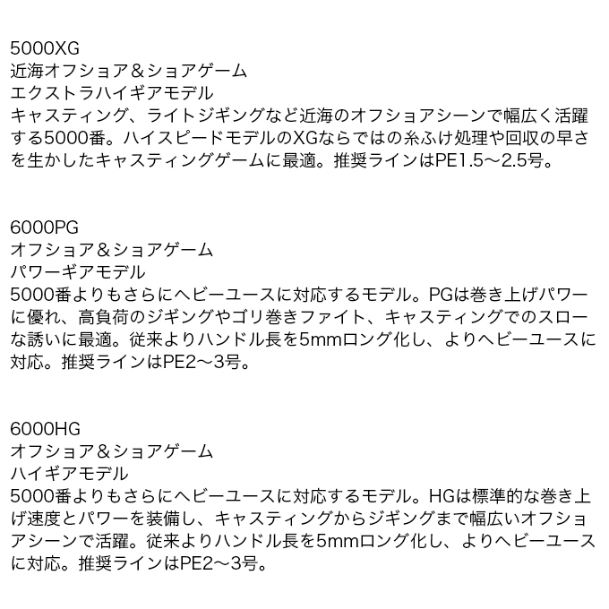 5000番よりもさらにヘビーユースに対応するモデル。HGは標準的な巻き上げ速度とパワーを装備し、キャスティングからジギングまで幅広いオフショアシーンで活躍。従来よりハンドル長を5mmロング化し、よりヘビーユースに対応。推奨ラインはPE2〜3号。