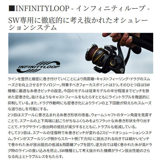 国内外で数多の実績をあげてきたステラSWが数々のテクノロジーとともにモデルチェンジ。XXタフドラグによるドラグ性能の向上、インフィニティループによるキャスタビリティの向上、インフィニティクロスによるギア強度・耐久性の向上、アンチツイストフィンによるライントラブルの防止など、さらなるアドバンテージをプラス。また、ハンドルノブへの防水シールの追加、ドラグノブの大径化など細部に至るまでブラッシュアップ。ソルトウォーターシーンで大物と真っ向から対峙するための性能にさらなる磨きをかけ、新生ステラSWが解き放たれる。