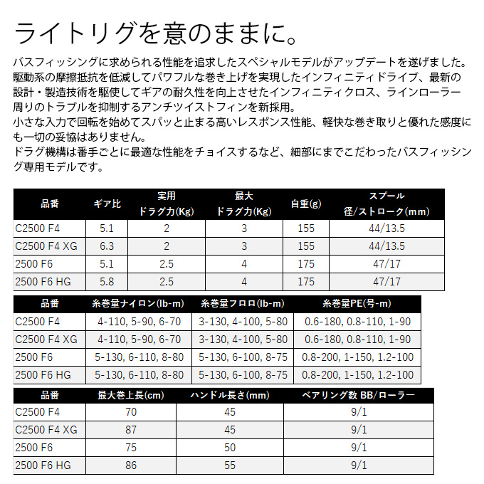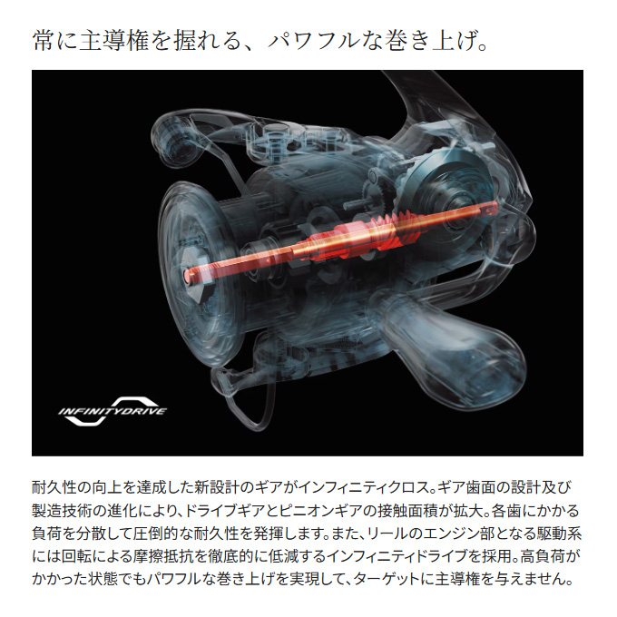 バスフィッシングに求められる性能を追求したスペシャルモデルがアップデートを遂げました。駆動系の摩擦抵抗を低減してパワフルな巻き上げを実現したインフィニティドライブ、最新の設計・製造技術を駆使してギアの耐久性を向上させたインフィニティクロス、ラインローラー周りのトラブルを抑制するアンチツイストフィンを新採用。小さな入力で回転を始めてスパッと止まる高いレスポンス性能、軽快な巻き取りと優れた感度にも一切の妥協はありません。
