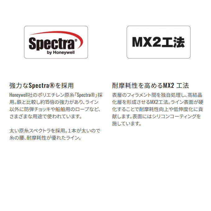 8本編をMX2工法で仕上げ、耐摩耗性の向上と適度な“ハリ/コシ”を可能にしました。スピニングリールだけでなく、