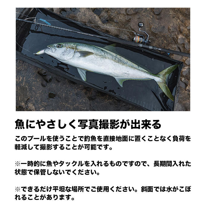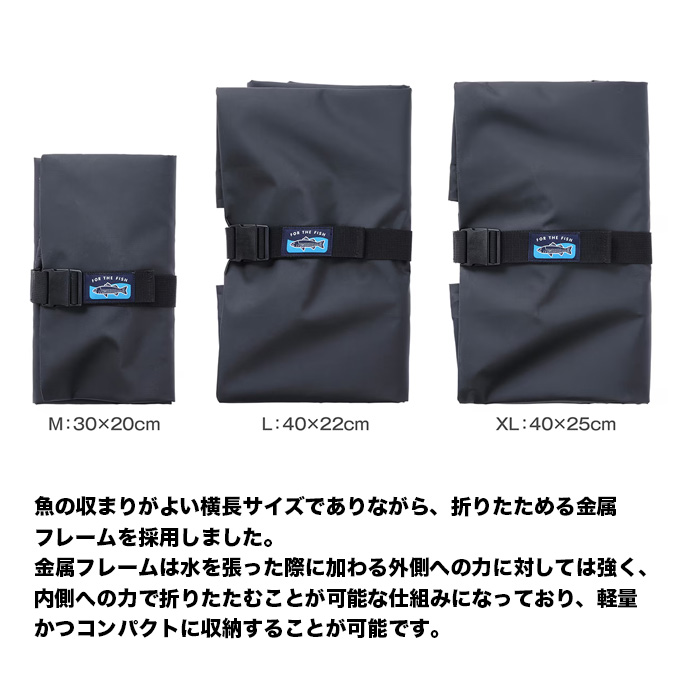 撮影のために釣った魚を地面の上に置くとどうしても弱らせてしまいます。小さくなって持ち運べるコンパクトフィッシュプールを使えば、現場で瞬時に魚を入れるプールができ、ゆっくりと魚の負荷を軽減しながら撮影することができます。魚が好き、大切にしたい、そんなアングラーに使ってほしいアイテムです。また、車にクーラーやバッグを積む際の折りたためるトランクトレーとしても重宝します。1つ持っておくと、魚の撮影、車での移動、様々な場面で活躍します。