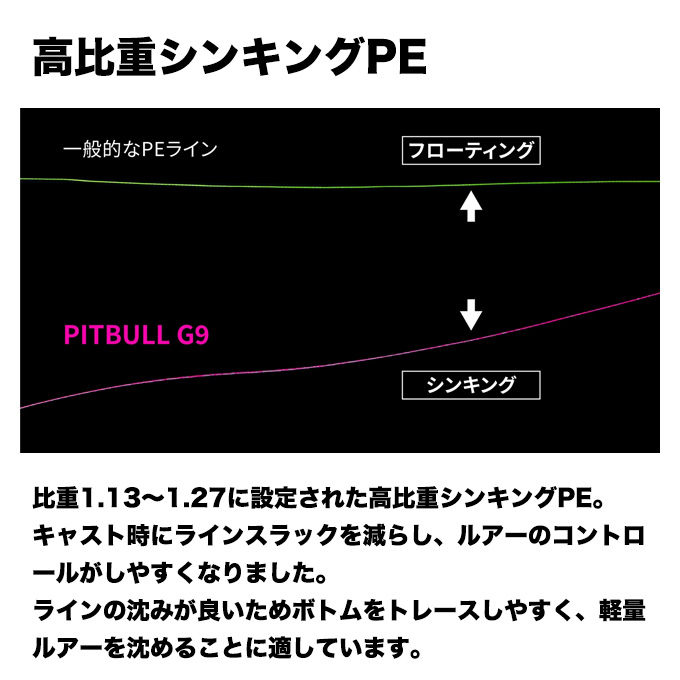 ■比重1.13〜1.27の高比重設計によりラインスラックを減らし、ルアーコントロール性が向上。