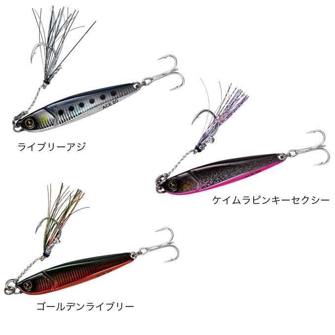 遠投性能とアピール力を兼ね添えたジグです。ショアジギングにおいて飛距離は最も大きなアドバンテージのひとつといえます。エースは圧倒的な飛距離を誇り、だれでもかんたんに遠投することが可能です。また、ワンピッチジャークやジャカジャカ巻き、ただ巻き等どんなアクションにも高次元で対応します。