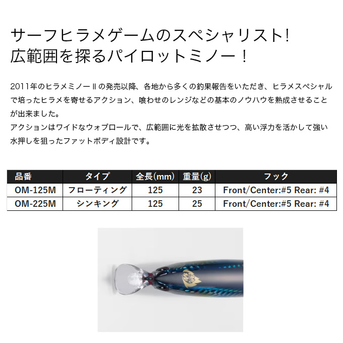 2011年のヒラメミノーIIの発売以降、各地から多くの釣果報告をいただき、ヒラメスペシャルで培ったヒラメを寄せるアクション、喰わせのレンジなどの基本のノウハウを熟成させることが出来ました。アクションはワイドなウォブロールで、広範囲に光を拡散させつつ、高い浮力を活かして強い水押しを狙ったファットボディ設計です。