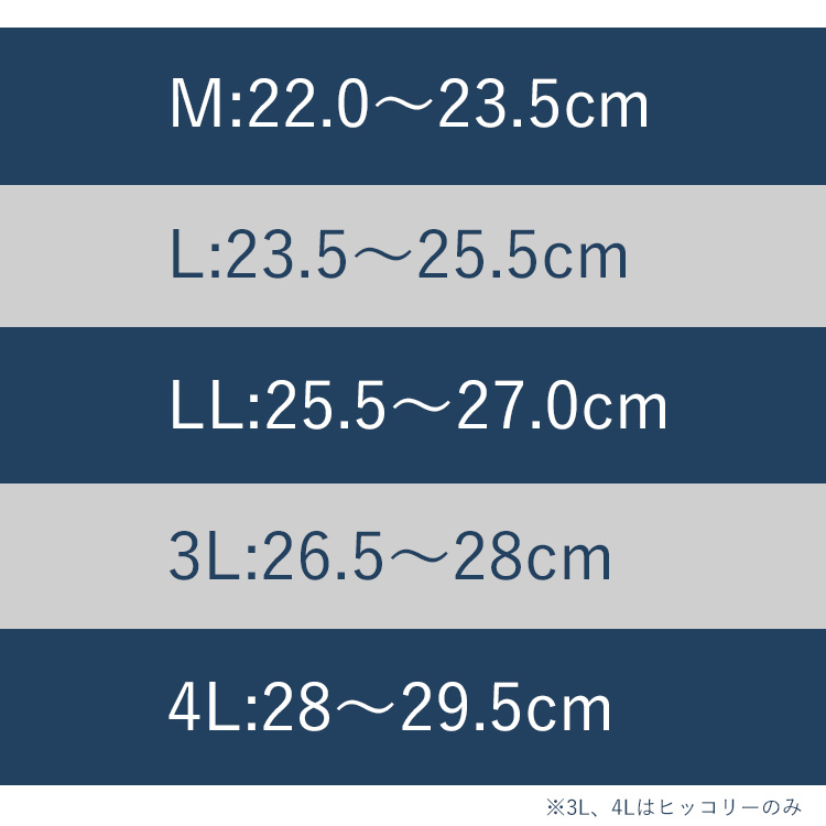 | サイズ(約) | M:22.0〜23.5cm対応 L:23.5〜25.5cm対応 LL:25.5〜27.0cm対応 3L:26.5〜28cm対応 4L:28〜29.5cm対応 |