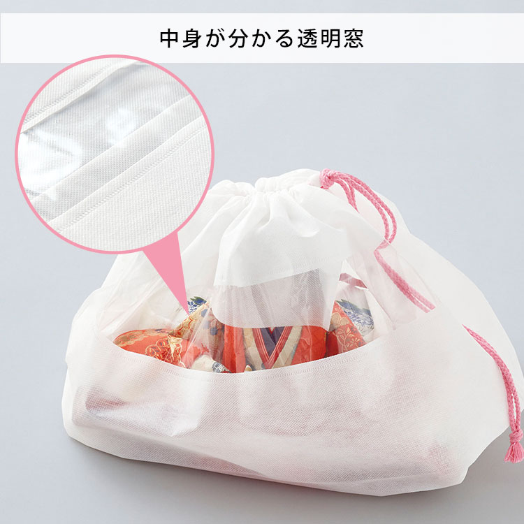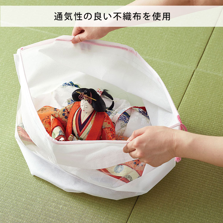 通気性の良い不織布を使用。出し入れしやすい巾着タイプの収納袋で大切なお雛様を守ります。