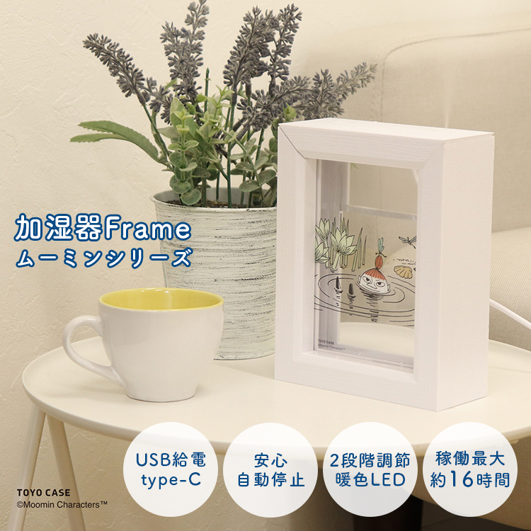 キーワード:/USB給電/タイマー/オートオフ/コードレス/長時間/ミスト量/調整/静音/静か/抗菌/軽量/軽い/簡単操作/LEDライト/暖色LED/2段階調光/長時間稼働/自動停止/超音波式/加湿/おしゃれ/可愛い/かわいい/シンプル/コンパクト/四角形/フレーム型/アート/イラスト/絵/癒し系/ナチュラル/スタイリッシュ/北欧デザイン/ムーミン/Moomin/東洋ケース/加湿器/卓上/携帯/超音波/ミニ/ポータブル/パーソナル/デスク/小型/スチームレス/ミスト/HUMIDIFIER/間接照明/照明/インテリア/加湿器frame/Frame/フレーム/スノークのおじょうさん/リトルミイ/スナフキン/ニョロニョロ/ムーミン谷/4511546150372/4511546150389/MHUM-FM-MMN2-01/MHUM-FM-MMN2-02/ホワイト/白/ブラウン/茶色/部屋/リビング/書斎/寝室/オフィス/会社/事務所/デスクワーク/テレワーク/在宅勤務/受験勉強/乾燥対策/花粉対策/風邪予防/肌/喉/潤い/旅行/出張/持ち運び/子供部屋/ベッドサイド/ギフト/北欧雑貨/北欧インテリア/空気清浄機/除湿器/季節家電/グッズ/リラックス