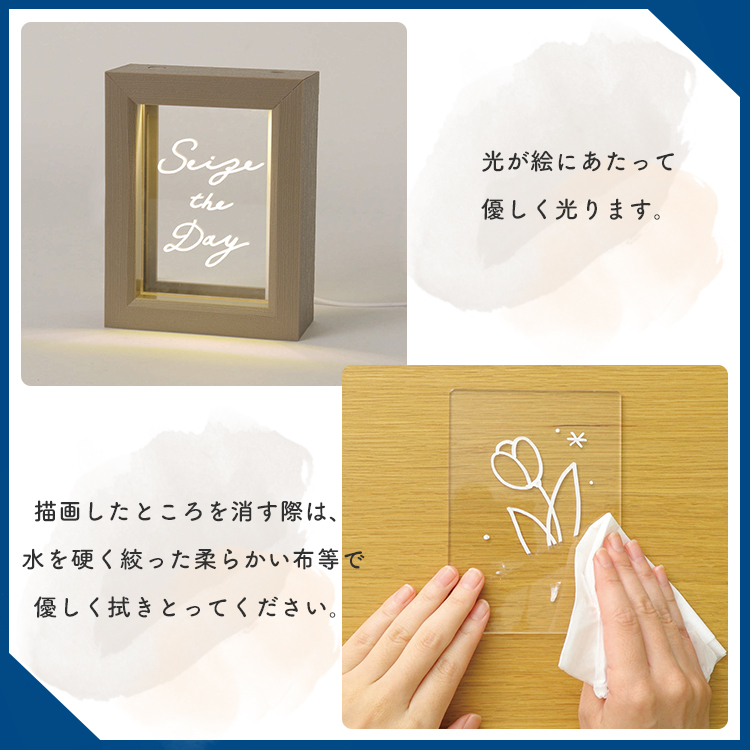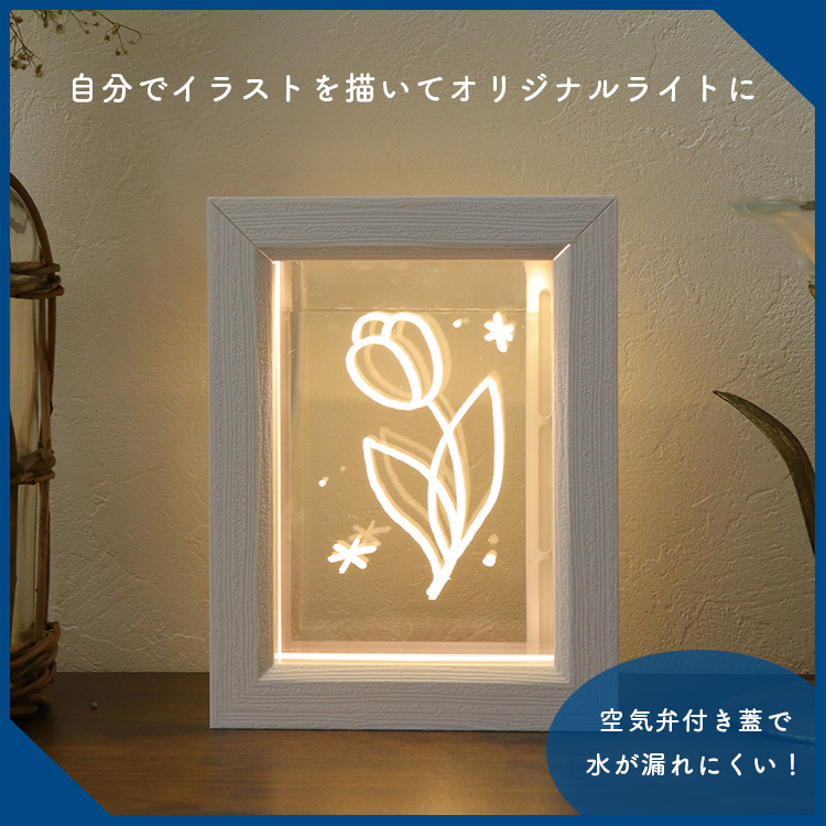 | 付属のアクリルパネルにお手持ちのホワイトマーカーで好きな絵を描いて飾ることができます。 またアクリルパネルにメッセージを書いて、付属のパネルと組み合わせる事で大切な人へのプレゼントにも! ※水を漏れにくくするための空気弁付き蓋を採用しました。 ※取扱説明書にはサンプルデザイン付き。 ※ブラックボードマーカーは付属しておりません。 |