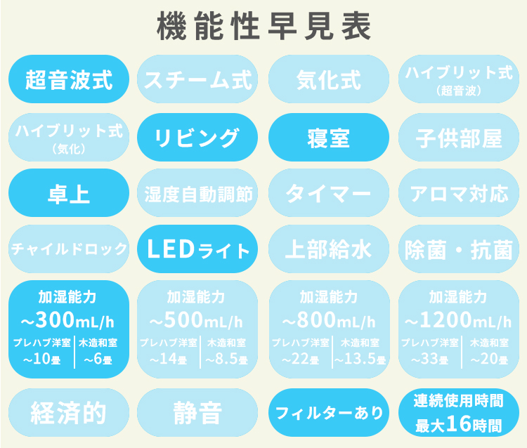 | ●稼働最大時間「約16時間」 勤務時間や就寝時にも対応した小型加湿器です。 ・連続噴霧:約8時間で自動停止 ・間隔噴霧:約16時間で自動停止 ●2段階調節暖色LED 暖色のLEDライトでリラックスタイムにも最適です。 ●安心自動停止 自動停止機能付きなので寝室での使用時に消し忘れても安心してお使いいただけます。 ●USB充電 USB接続でパソコンやUSBバッテリーから給電できます。 |