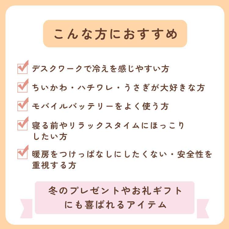 | ・お仕事中に: デスクワークで冷える背中や腰に当てて、お仕事中もぬくぬく! ・お家でのんびり: 読書やテレビを見ながら、抱っこしてリラックスタイムを。 ・どこでも一緒: モバイルバッテリーを使えば、車内や屋外、旅行先などどこでも温かいちいかわたちと過ごせます。 ・ギフトにも最適 |