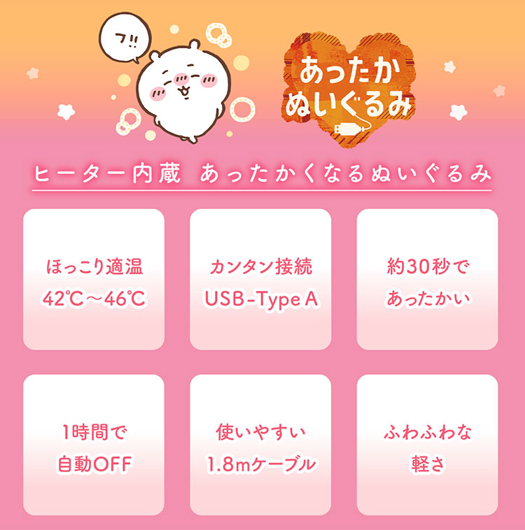 | 【どこでもぬくぬく!】 ヒーターを内蔵!冷えやすい手元や背中をじんわり温めます。 【選べる3種類】 ちいかわ、ハチワレ、うさぎの可愛いデザイン。思わず抱きしめたくなる愛らしさです。 【使いやすいUSB式】 USB Type-Aで接続可能。PCやモバイルバッテリーに繋げば、デスクワーク中やお家でのリラックスタイム、外出先でも使用できます。 【約30秒で温かい】 スイッチを入れてから約30秒でぬくもりが広がり始めます。 【ちょうど良い温度】 ほっこり心地よい温度(42℃〜46℃)で、じんわりと温めます。 【安心・安全機能】 1時間で自動OFF機能付きで、切り忘れの心配が少なく安心です。 【ふわふわ・軽量】 持ち運びやすいふわふわな肌触りと、ストレスにならない軽さです。 【ゆったりケーブル】 ケーブルの長さは1.8mとゆったり設計で、コンセントの位置を気にせず使えます。 <font color="#ff3300">※こちらの商品は、コードレスではなく給電式です。モバイルバッテリーなどから電源をおとりください。</font> |