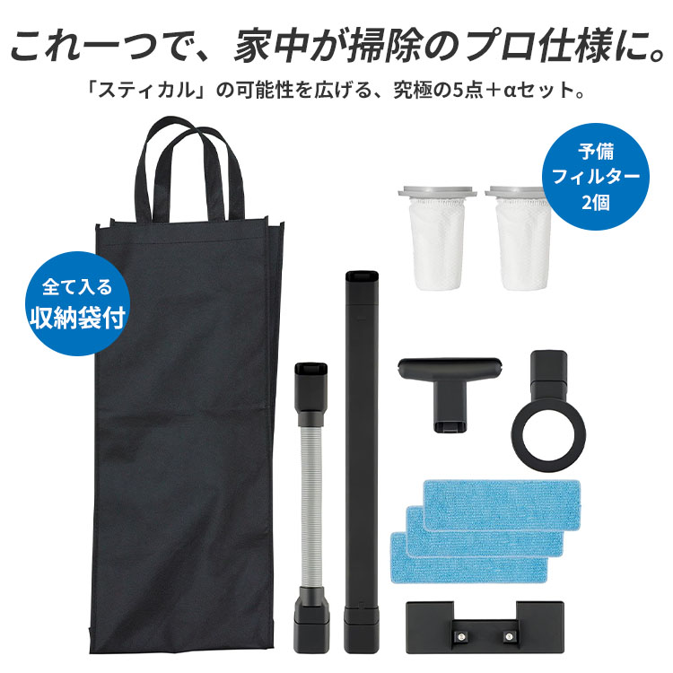 スティカル専用オプションセット!5種のノズルで家中まるごとプロ仕様。布団、エアコン、車内、玄関までこれ1台。洗える予備フィルター2個&便利な収納袋付きでお手入れも万全!