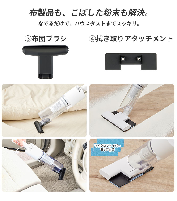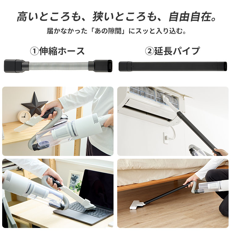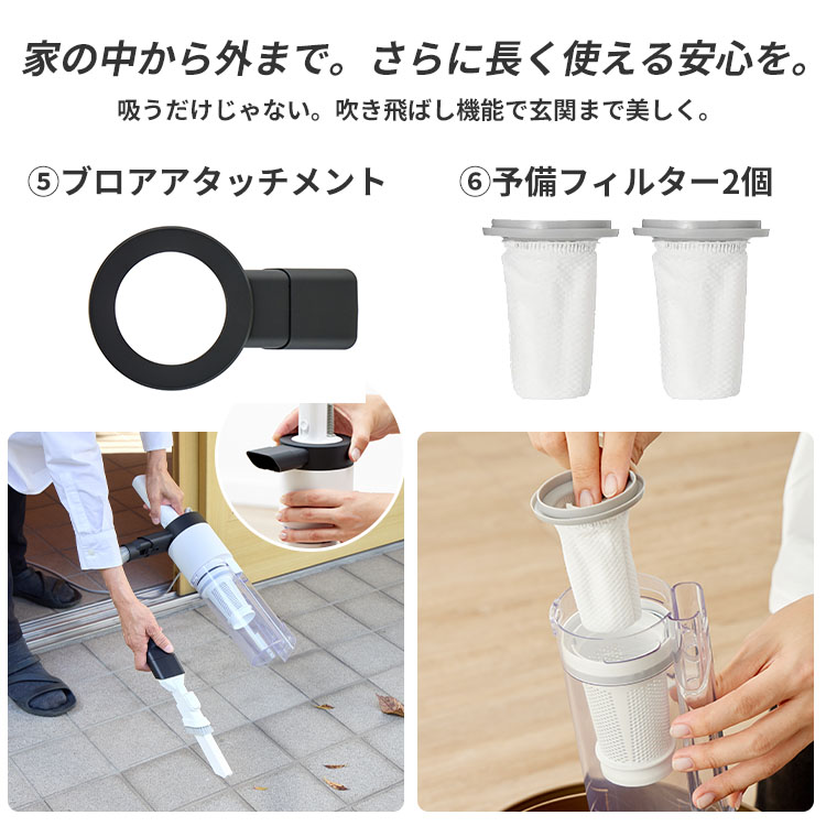 | ■ 届かない場所をゼロにする「5種のアタッチメント」 掃除する場所に合わせて自由自在にカスタマイズ。標準ヘッドでは入り込めなかった隙間や高い場所も、これ一つで解決します。 伸縮ホース:デスクの上や棚の小物を避けて、自由な角度で。 延長パイプ:エアコンの吹き出し口や、ベッド・ソファの奥底まで。 布団ブラシ:布団や布製ソファのハウスダスト、車内のシートケアに。 拭き取りノズル:こぼした粉末やパンくずを、拭き取るように一掃。 ブロア機能:玄関の砂や落ち葉を吹き飛ばし、サッシの溝もスッキリ。 ■ メンテナンスの不安を解消「予備フィルター×2」 「洗ったフィルターが乾くまで掃除ができない…」そんなストレスをなくすため、洗い替え用の予備フィルターを2個同梱しました。24時間、いつでも最高の吸引力で掃除がスタートできます。 ■ 全パーツを賢くまとめる「専用収納袋」 「パーツが多すぎてバラバラになる」という不満を解決。全てのオプションがひとまとめに収まる巾着袋をセットにしました。クローゼットのフックに掛けて、スマートに保管できます。 |