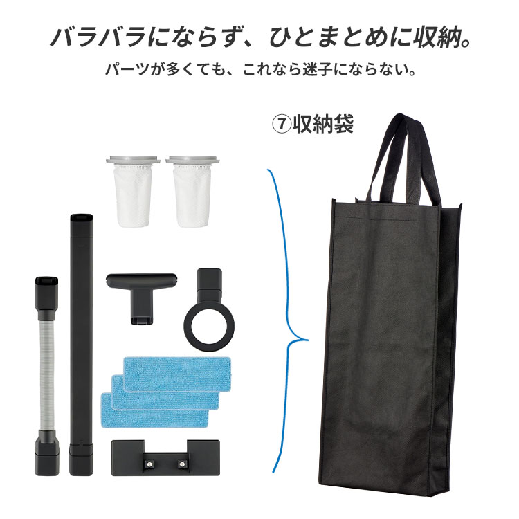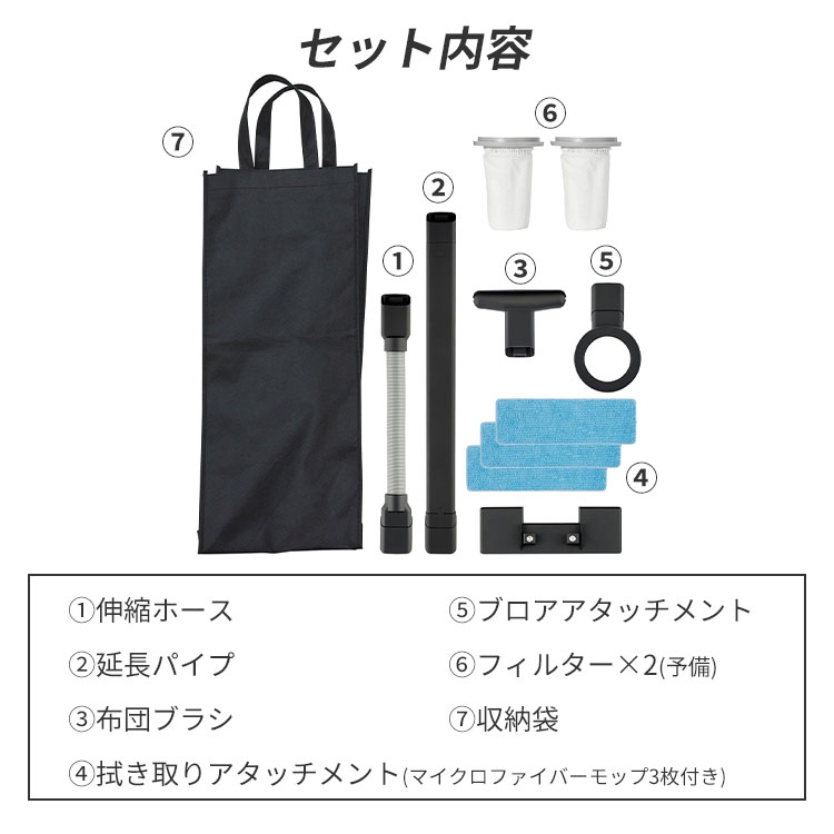■セット内容・構成品:伸縮ホース、延長パイプ、布団ブラシ、拭き取りアタッチメント(マイクロファイバーモップ3枚付き)、ブロアアタッチメント、フィルター×2(予備)、収納袋