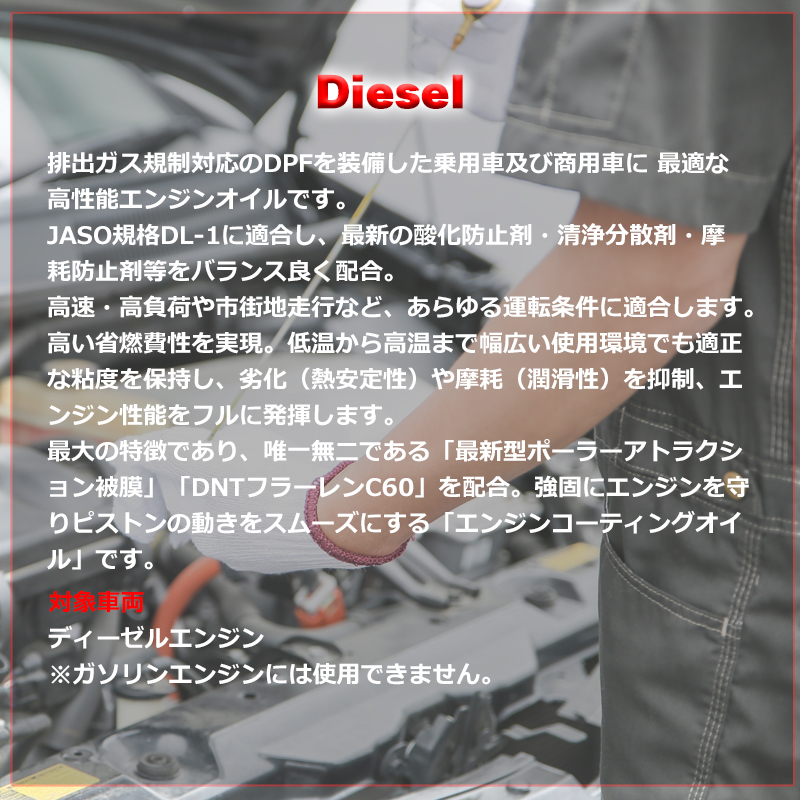 ●最大の特徴であり、唯一無二である「最新型ポーラーアトラクション被膜」「DNTフラーレンC60」を配合。強固にエンジンを守りピストンの動きをスムーズにする「エンジンコーティングオイル」です。