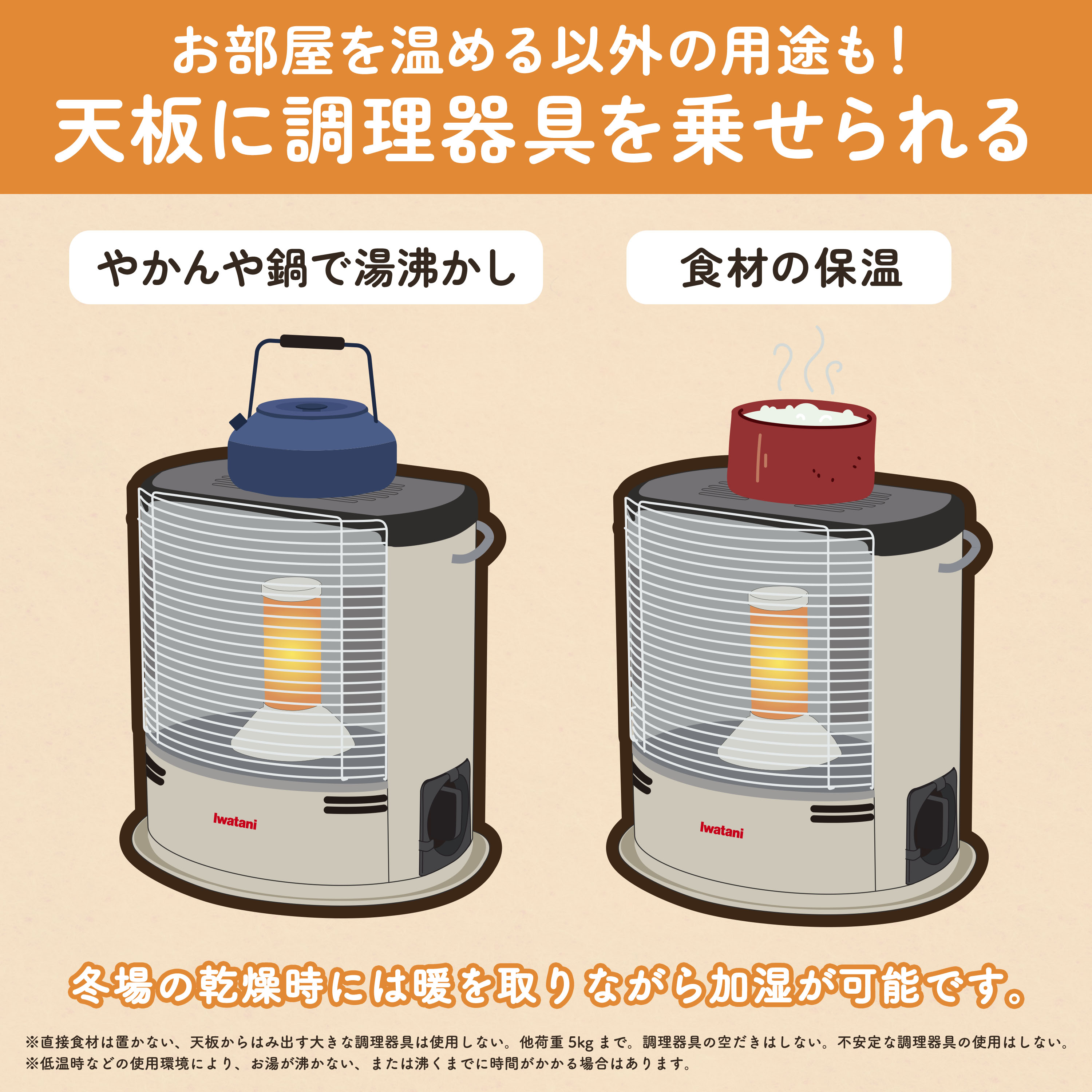 ・ストーブの天板にやかんを載せておくだけでお湯が沸かせます。また冬場の乾燥時には、暖を取りながら加湿も可能です。