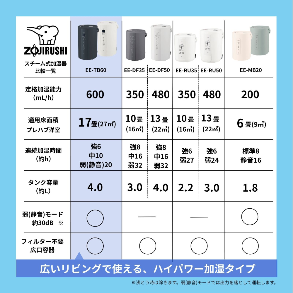 象印マホービン スチーム式加湿器 ハイパワー加湿 加湿量600mL/h(木造10畳/プレハブ洋室17畳まで) タンク4.0L ホワイト EE-TB60-WA