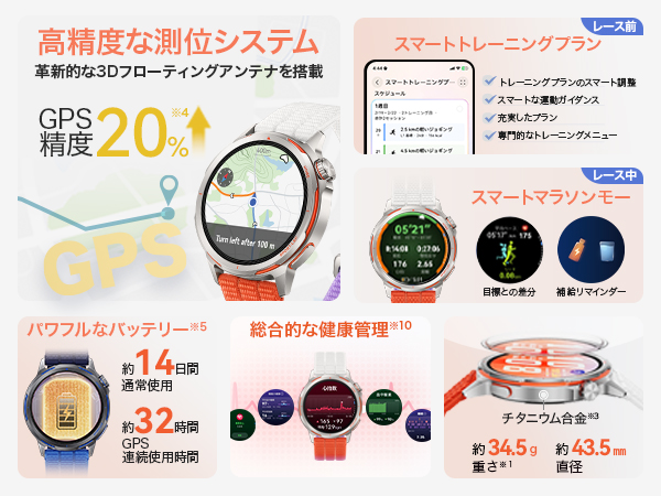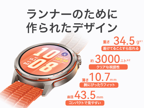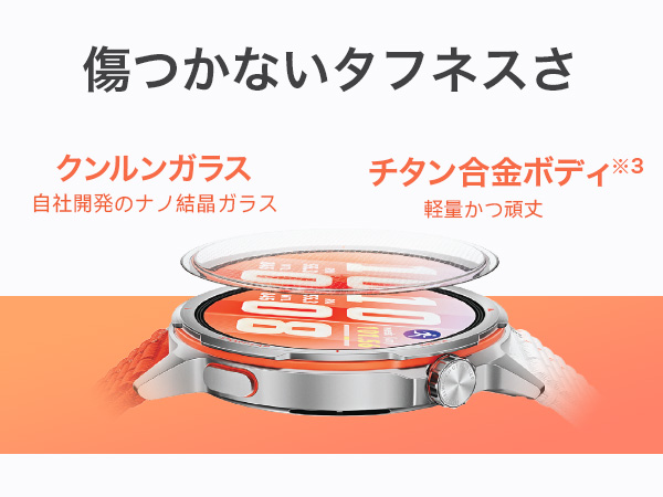 本体ケースに強靭かつ超軽量なチタン合金、ディスプレイには高耐久な「クンルンガラス」を採用。厚さ約10.7mm、重量約34.5gというスチール製時計の約3分の1の軽さを実現し、長距離走でも手首の疲労を最小限に抑えます。
