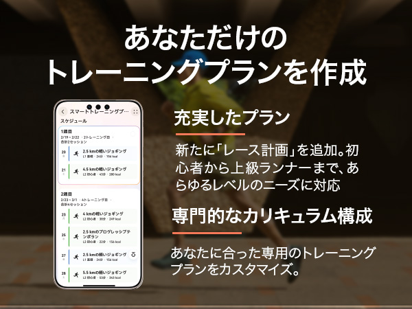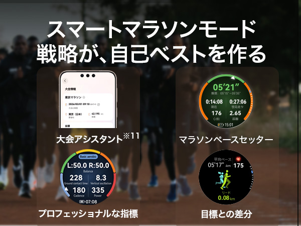 Q3.ランニングを科学的にサポートする専用機能にはどのようなものがありますか?主な機能:スマートトレーニングプラン、スマートマラソンモード、ランニング能力指数(RAI)、リカバリータイム。対象製品:HUAWEI WATCH GT Runner 2。進化したポイント:大会目標に合わせてメニューを自動生成する「スマートトレーニングプラン」が進化しました。達成度や身体状況に応じてプランを動的に調整するほか、「スマートマラソンモード」ではリアルタイムのペースガイダンスや補給通知により、レース戦略を強力にサポートします。