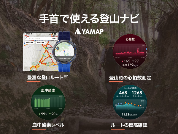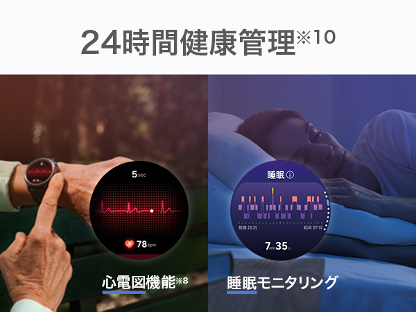 世界対応のゴルフナビ機能(グリーンアンジュレーション対応)や登山、水深約40mのダイビングなど100種以上のワークアウトに対応。また、日本国内の医療機器承認を取得した心電図計測をはじめ、心拍数・血中酸素・睡眠・ストレスなどを24時間多角的に守ります。