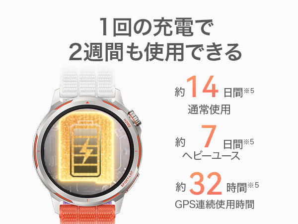通常使用で約14日間、屋外ワークアウトでも最大約32時間の連続駆動を実現。ウルトラマラソンや連日のゴルフでも、充電を気にせず挑戦し続けられます。