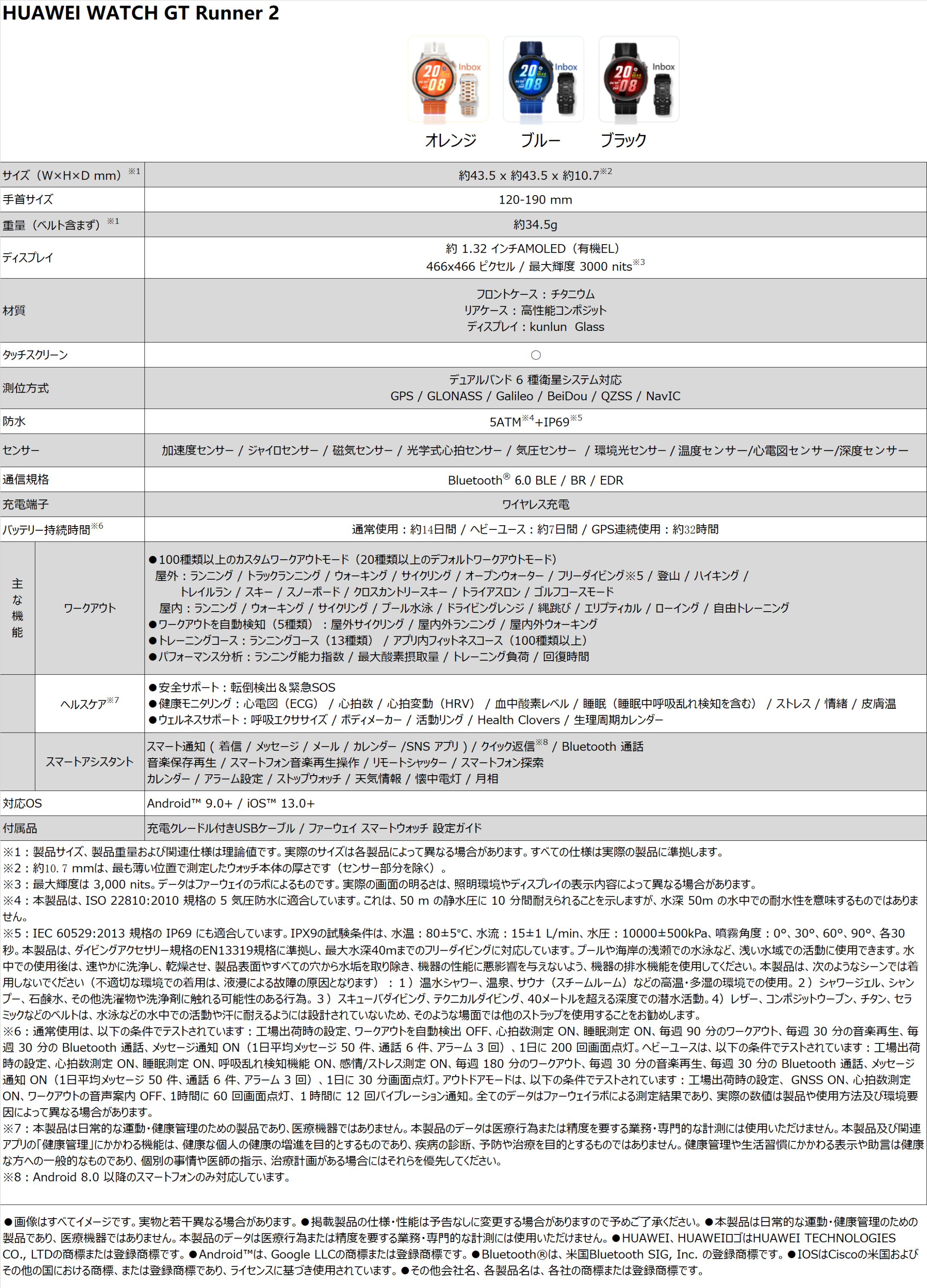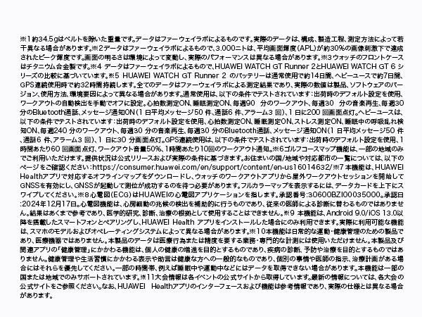 ? Q4.HUAWEI WATCH GT Runner 2 の文字盤や耐久性について教えてください。100種類以上のスポーツ特化型文字盤に加え、常時表示(AOD)に対応。ランニング中に必要なデータを一目で確認できるようカスタマイズ可能です。<耐久性と付属品について>強靭なチタン合金ケースと、耐衝撃性に優れた「クンルンガラス」を採用。ハードな環境下でも安心して使用できる堅牢性を誇ります。※特典:標準のナイロン製スポーツベルトに加え、シーンに合わせて交換可能な公式フッ素ゴム製ベルトが1本同梱されています。