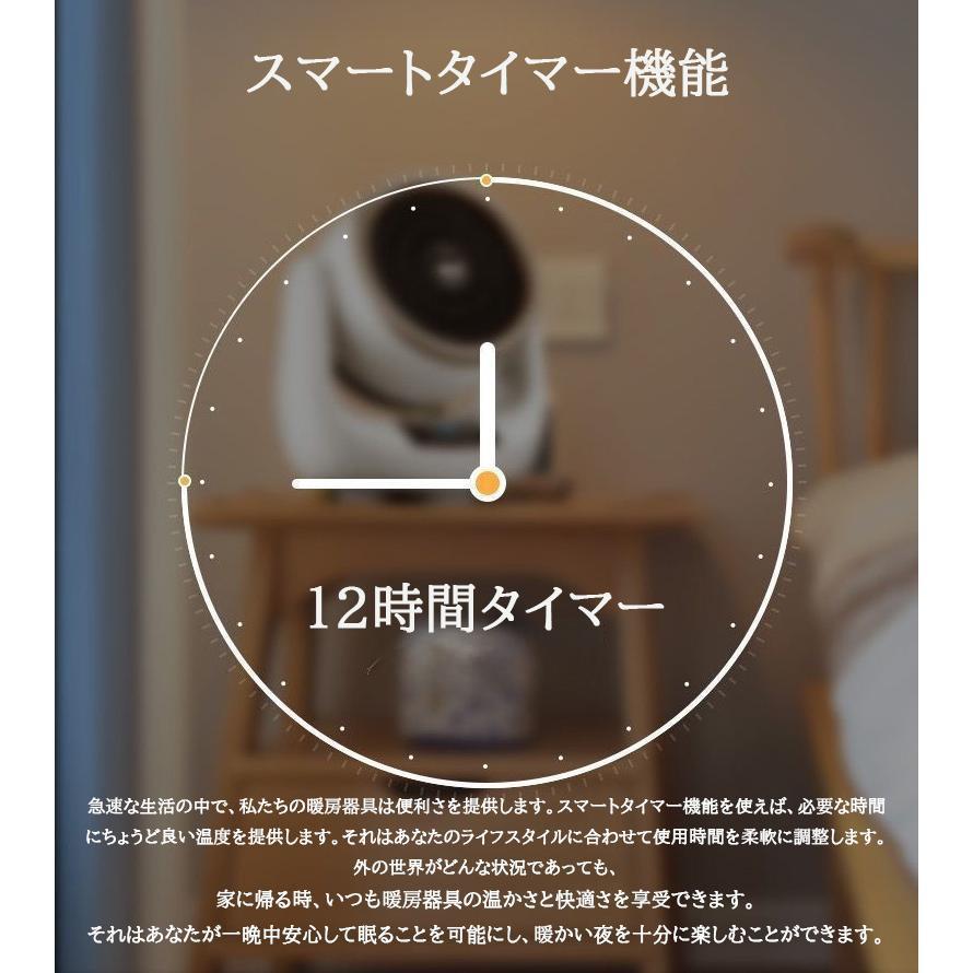 セラミックファンヒーターは、設定した時間後に自動的に電源が切れになるタイマー機能が備わっており、生活リズムやシーンに合わせて1時間刻みでタイマーを設定、最大で12時間まで可能です。電源を消し忘れないようにするだけでなく、目覚める時間に合わせて設定することもできます。ファンヒーターにはリモコンも付属しており、寒い冬の間でも暖かいベッドやソファから出ずに、指先で簡単に操作できます。